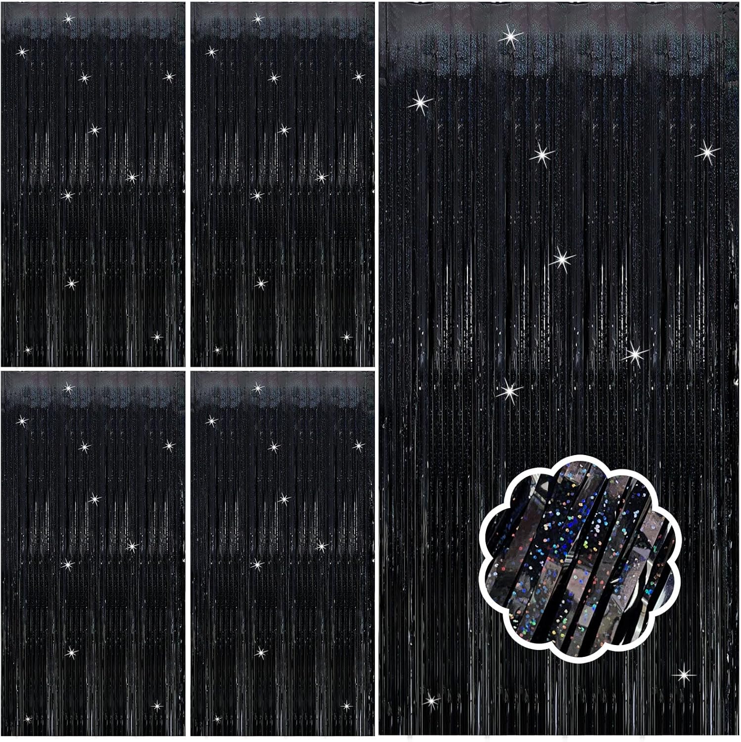 - Black Steamers Set (5-Pack): Each dazzling curtain measures 3.28ft x 6.56ft – perfect for doors, walls, or photo booths! These extra-long foil streamers instantly transform any space into a party-ready celebration zone. Mix, layer, and customize your decor for the best results.