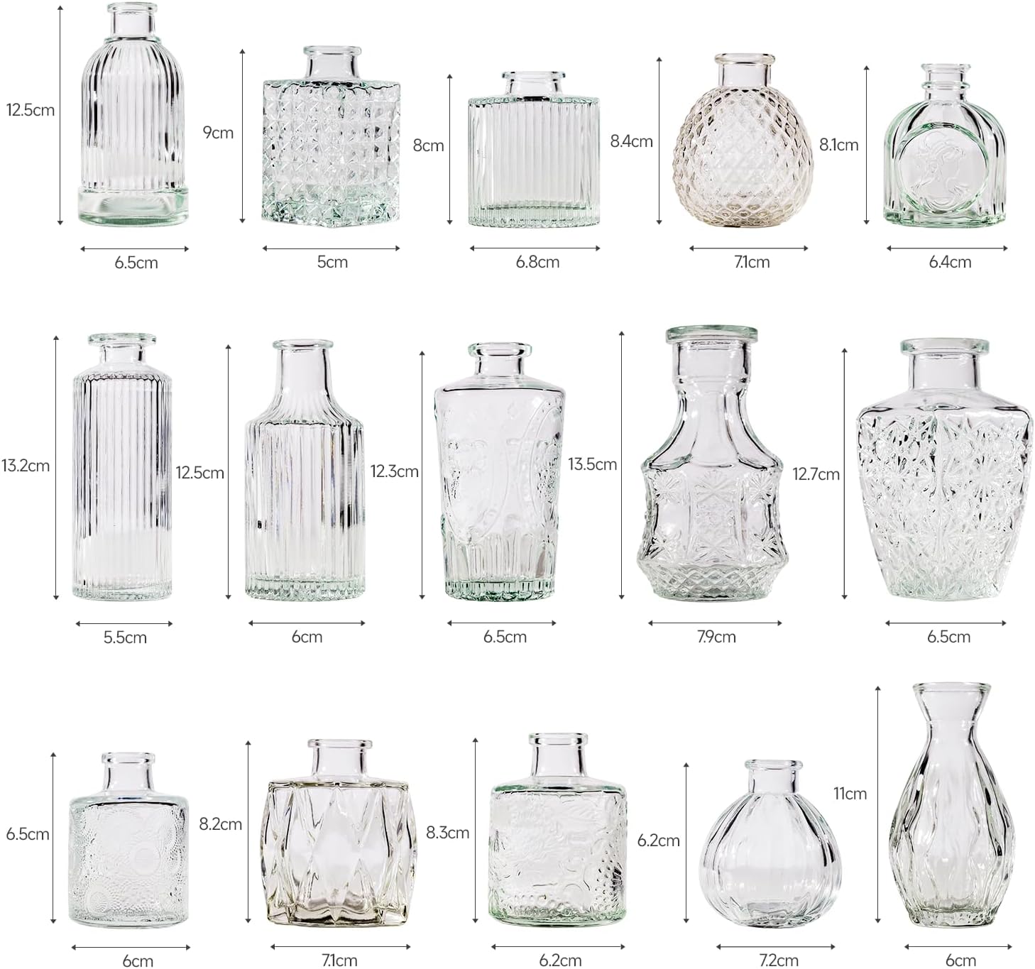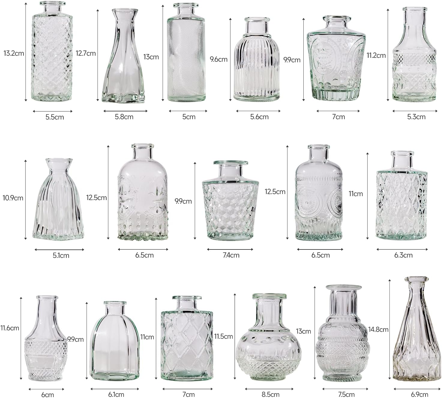 - VERSATILE DESIGN: Each small clear vase has a beautiful embossed pattern,suitable for all seasons, various sizes and shapes, smooth lines,you can mix and match flowers with elegant vases as you like, velvet flowers and dried flowers are also good choices.