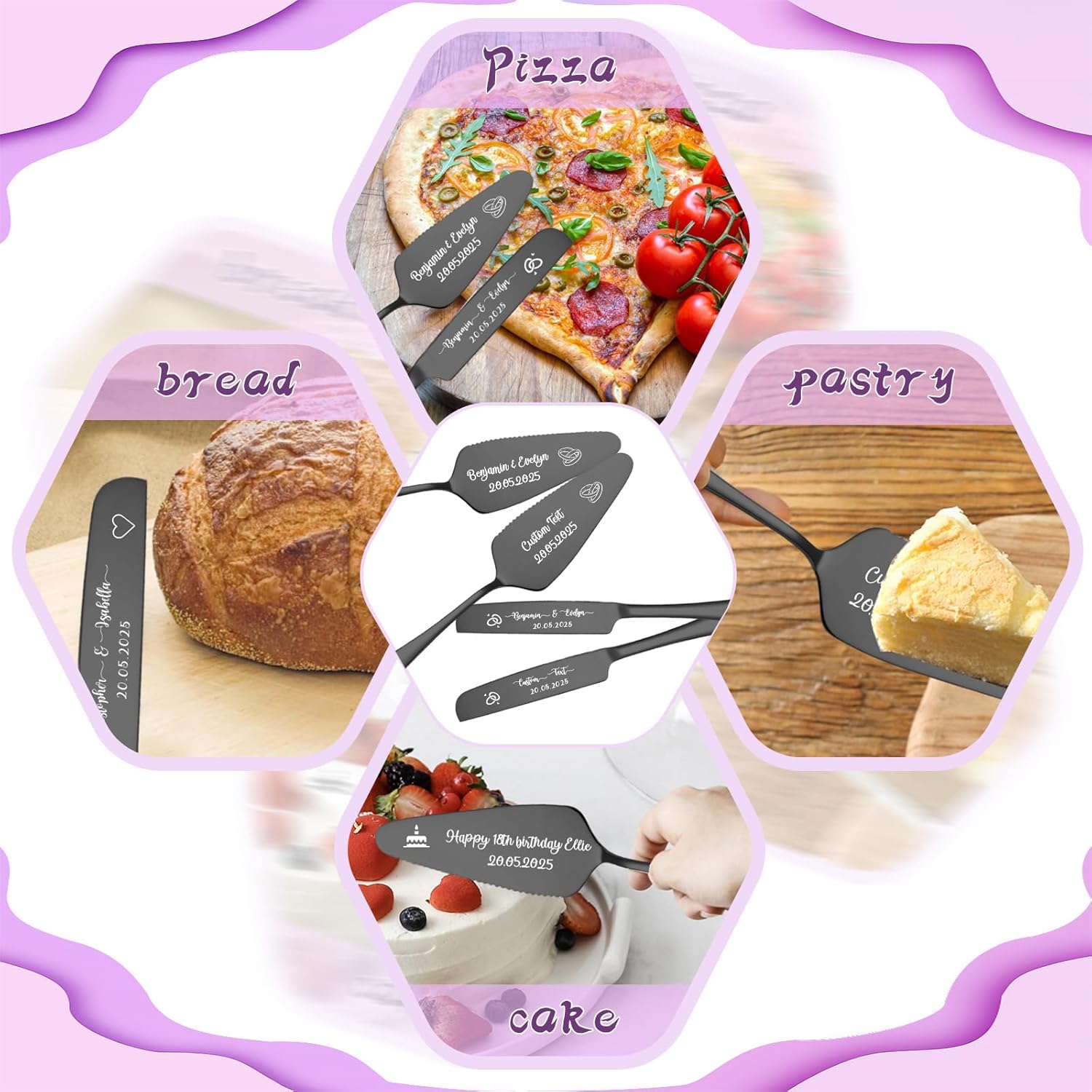 - Personalized Wedding Cake Knife and Server Set:Our wedding cake cutting set features personalized design as the core highlight, injecting a unique romantic imprint into your wedding! Using laser engraving technology, you can engrave the names of the bride and groom, wedding date, or exclusive love motto on the cake knife and server set, making the tableware an "exclusive token" that carries emotions