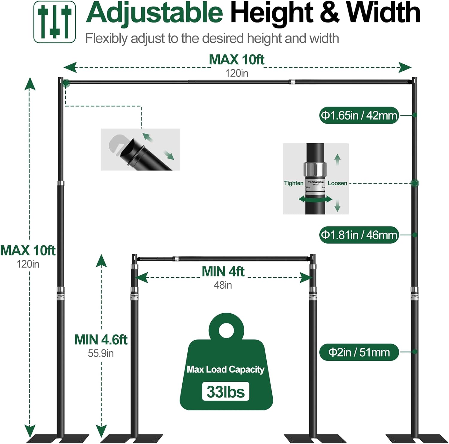 - Adjustable Backdrop Stand: Backdrop stand 10x10ft adjustable with telescopic rod locking design, easy to adjust the height (4.6ft-10ft / 55.9in-120in) and width (4ft-10ft / 48in-120in) to meet your needs for different sizes of background