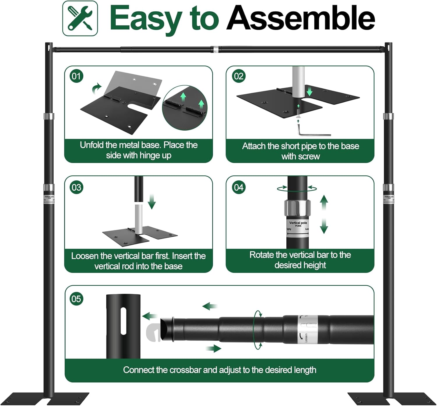 - Easy Assembly: Installation accessories and instructions are included in the package, making it easy to assemble the metal backdrop stand in just a few minutes