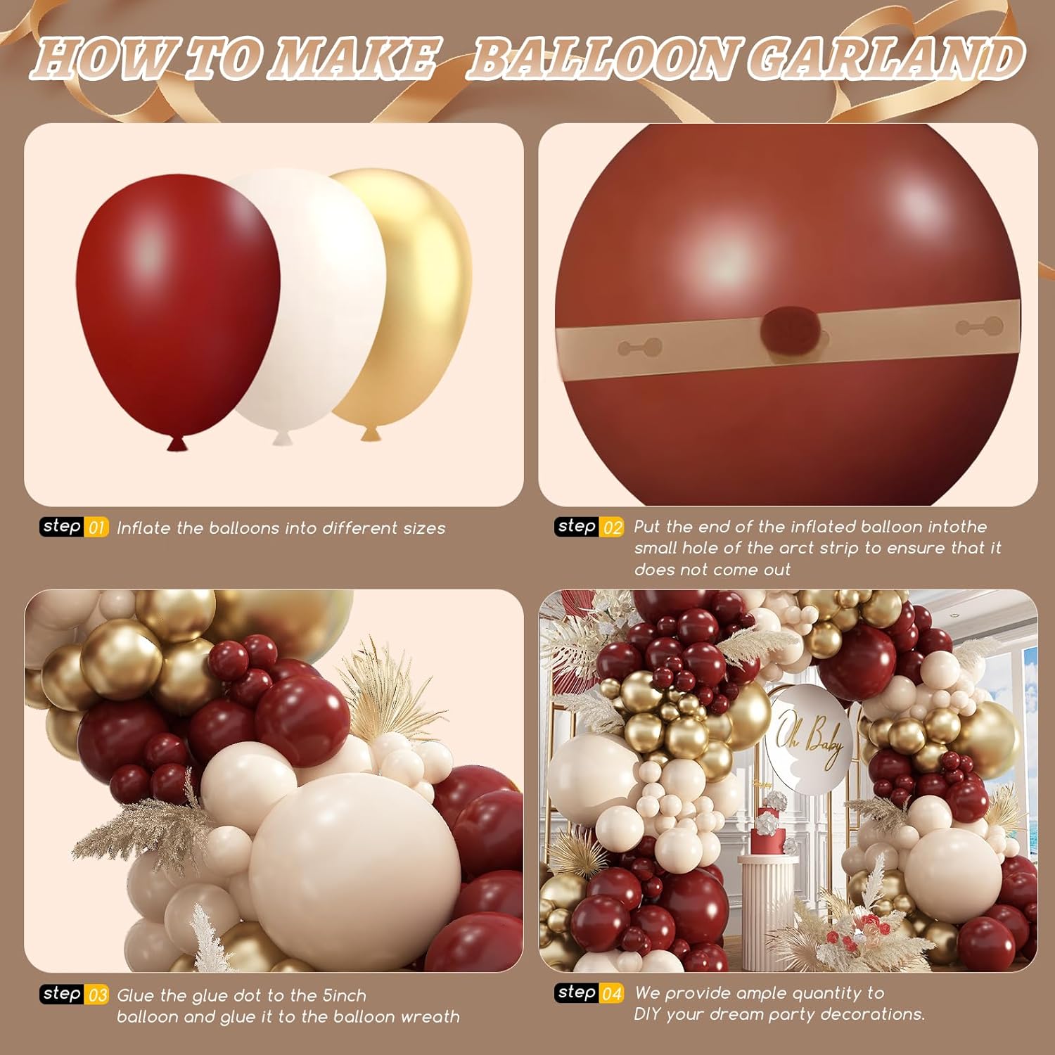 - Package List :maroon and gold balloons includes 18" burgundy/metallic gold/sand white balloons(12 pcs), 12" burgundy/metallic gold/sand white balloons(100 pcs), 10" burgundy/metallic gold/sand white balloons(100 pcs), 5" burgundy/metallic gold/sand white balloons(100pcs),glue dotsx200, ribbonx2, decorative stripx2. plenty in quantity, Perfect for maroon and gold graduation decorations