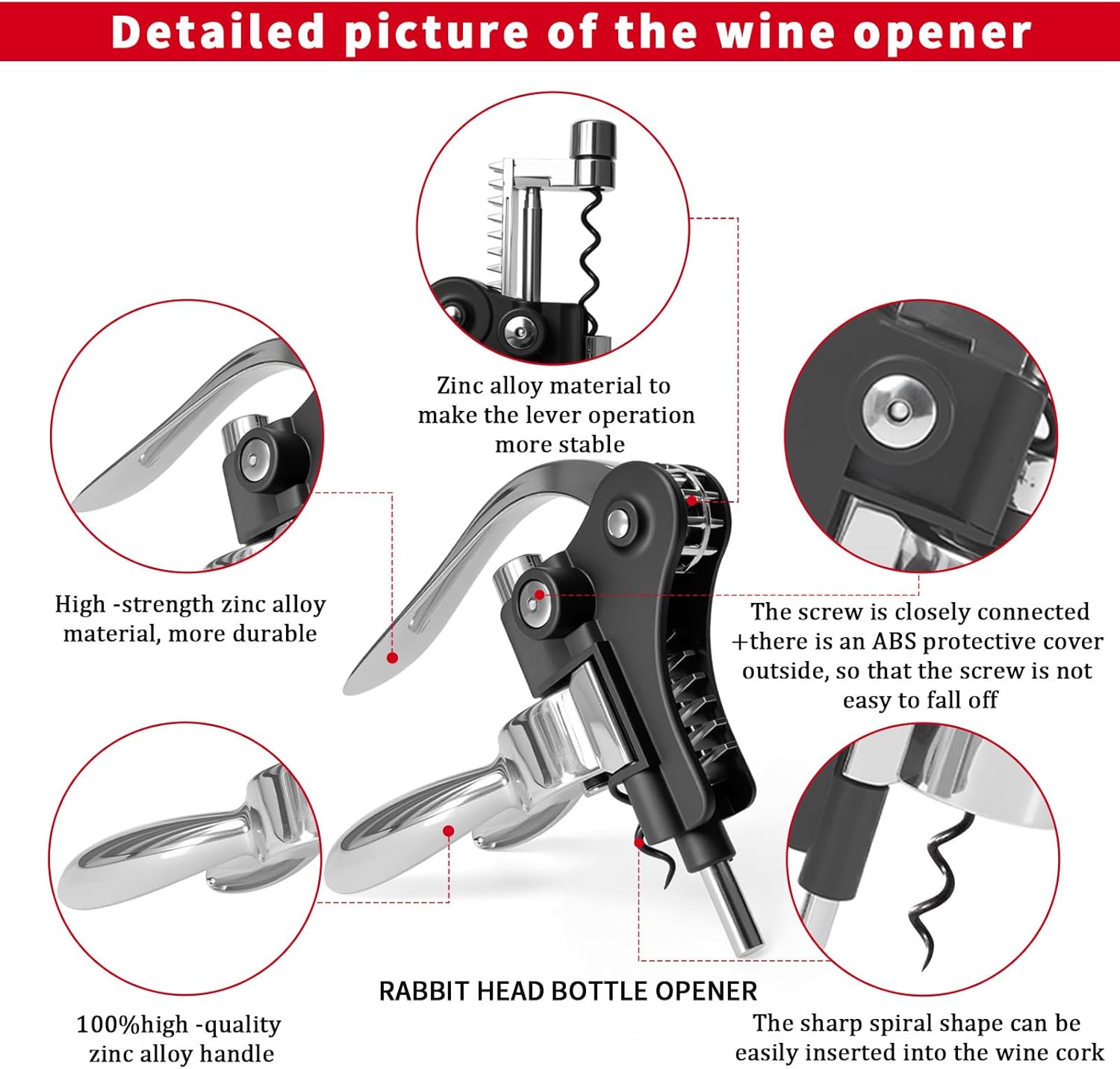 - 2.Wine Gift Set: This rabbit wine opener set includes rabbit wine opener,foil cutter, bottle stopper, drip ring, and wine pourer. It can easily remove cork from the wine bottle without effort. The rabbit wine bottle opener has a luxurious appearance and has a long durability