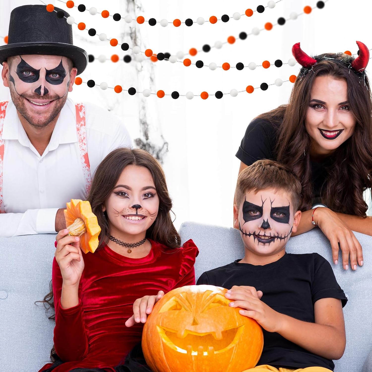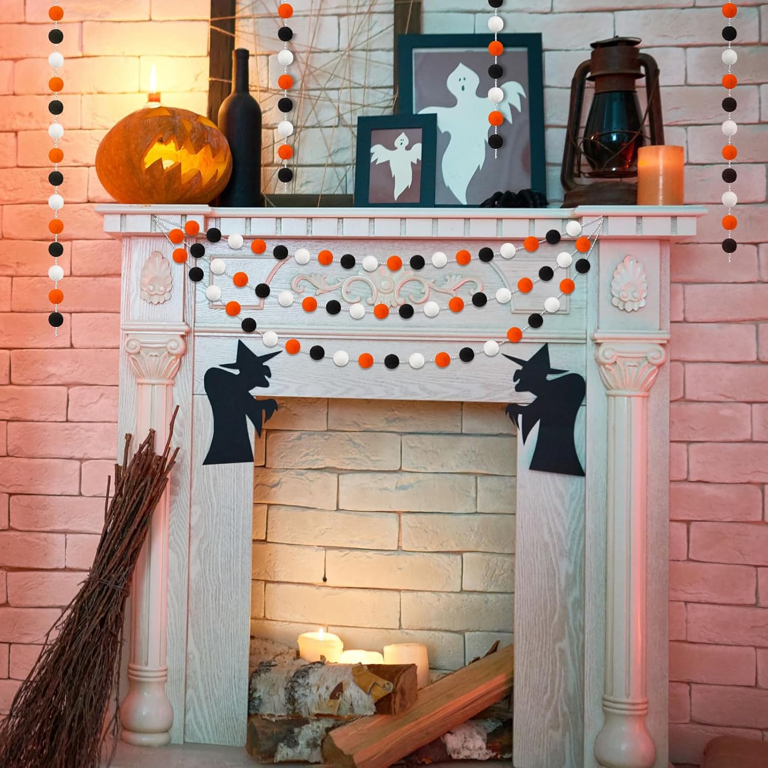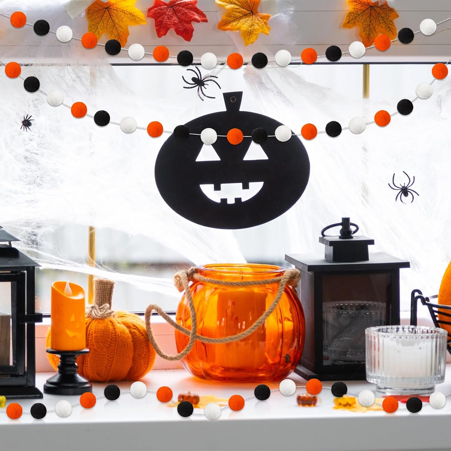 3 Pack Pom Pom Garland Colorful Felt Ball Garland Decorations, 6.5 Feet Long with 30 Balls Banner Hanging Supplies for Halloween, Parties (Orange, black &White)