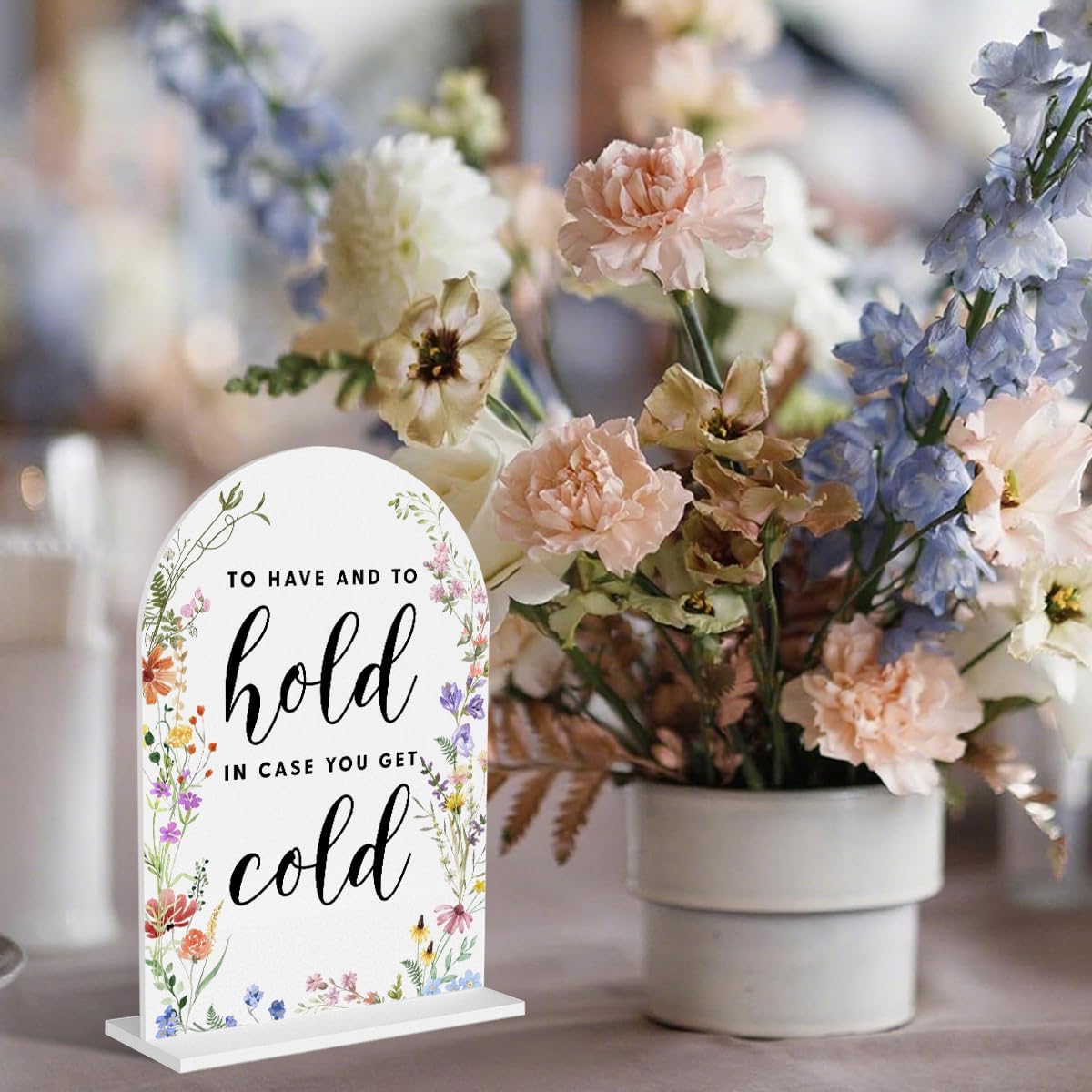 Acrylic Wedding Signs, To Have And To Hold Signs for Marriage Reception, Bridal Shower Decorations, Modern Arched Round Top Acrylic Table Top Sign with Holder for Wedding Party (White Wildflowers)