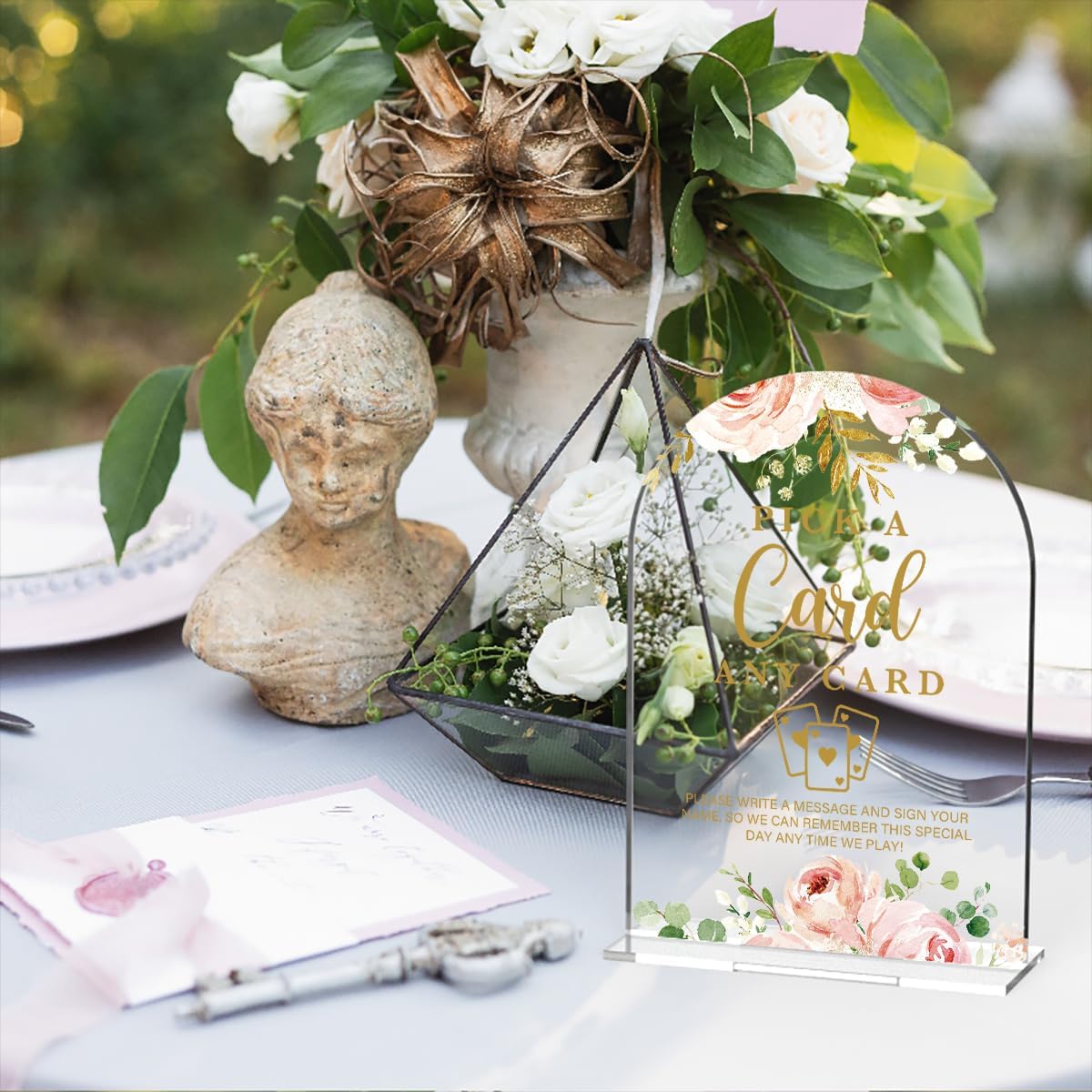 Acrylic Wedding Signs, Bridal Shower Decorations, Pick A Card Signs for Reception, Modern Calligraphy Arch Acrylic Table Top Sign for Wedding Reception and Engagement Parties (Clear Pink Flowers)