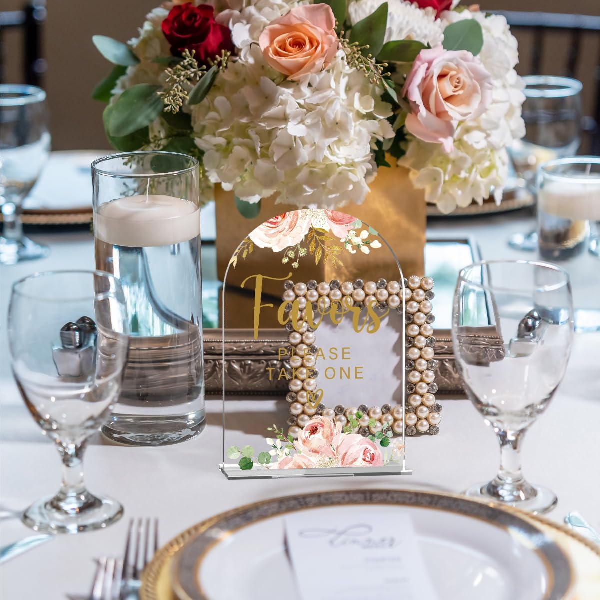 Acrylic Wedding Signs, Bridal Shower Decorations, Modern Calligraphy Arch Acrylic Table Top Sign for Wedding Reception and Engagement Parties - Favors Please Take One (Clear Pink Flowers)
