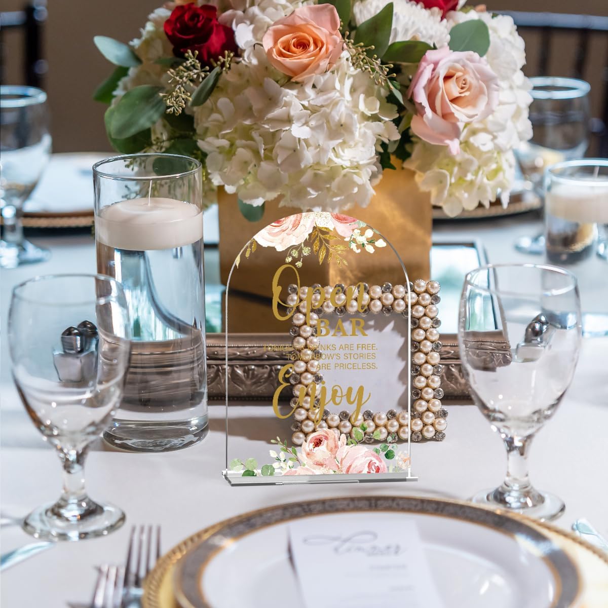 Acrylic Wedding Signs, Bridal Shower Decorations, Open Bar Signs for Reception, Modern Calligraphy Arch Acrylic Table Top Sign for Wedding Reception and Engagement Parties (Clear Pink Flowers)