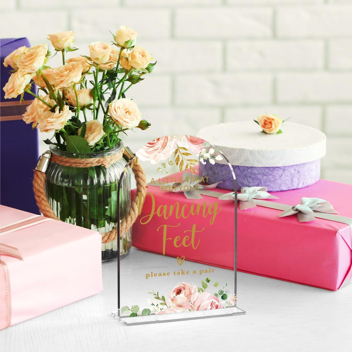 Acrylic Wedding Signs, Bridal Shower Decorations, Dancing Feet Signs for Reception, Modern Calligraphy Arch Acrylic Table Top Sign for Wedding Reception and Engagement Parties (Clear Pink Flowers)