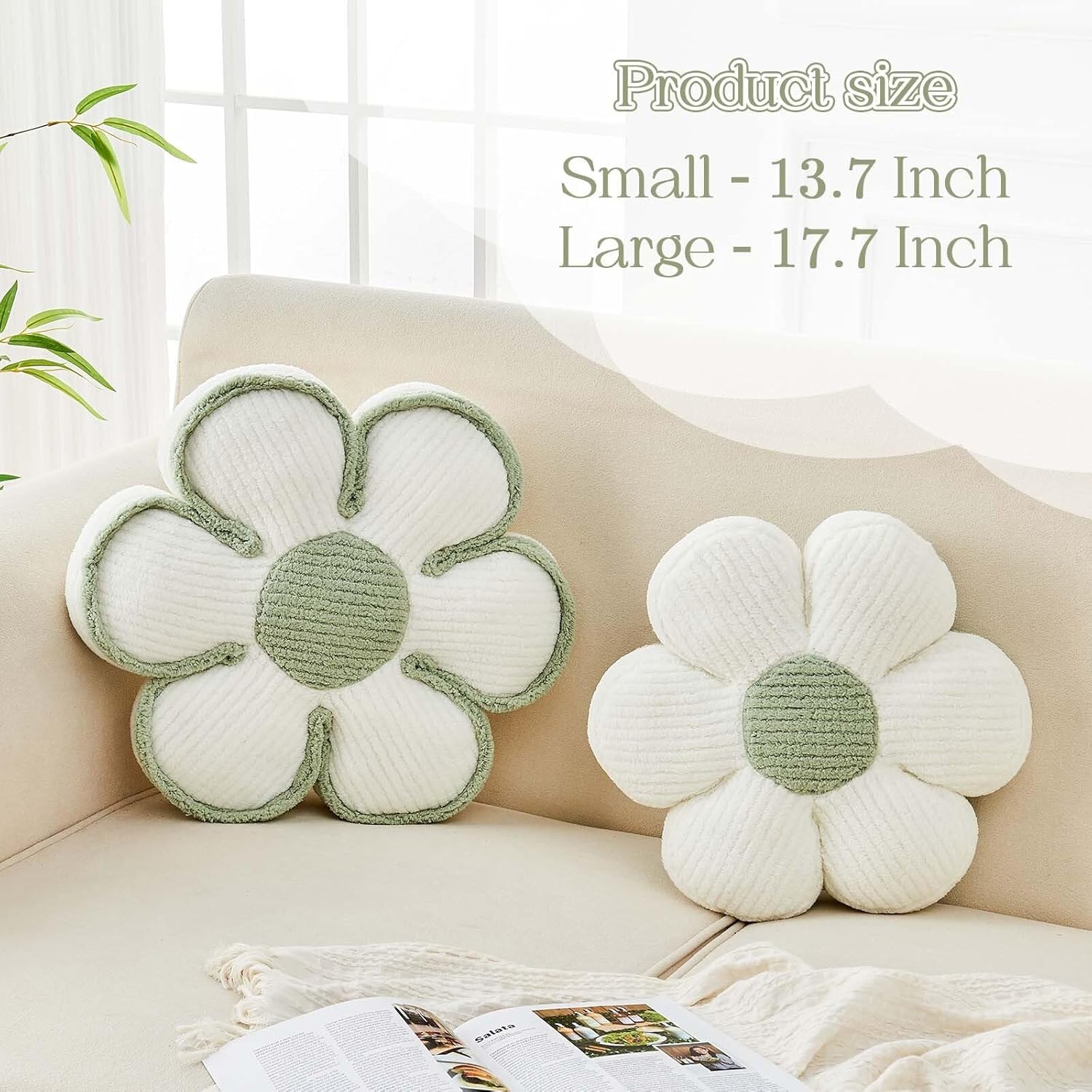 - DECORATIVE FLOWER PILLOWS OF VARIOUS SIZES - This floral throw pillow is not only a practical choice, but also a decorative addition to your living space. Small size - 13.7 Inch with 3 inch thickness, Large size - 17.7 inch with 4 inch thickness, whether placed on the floor, sofa or bed, it can effortlessly enhance the overall beauty of the room, adding cuteness and vitality to your bedroom decor a feeling of.