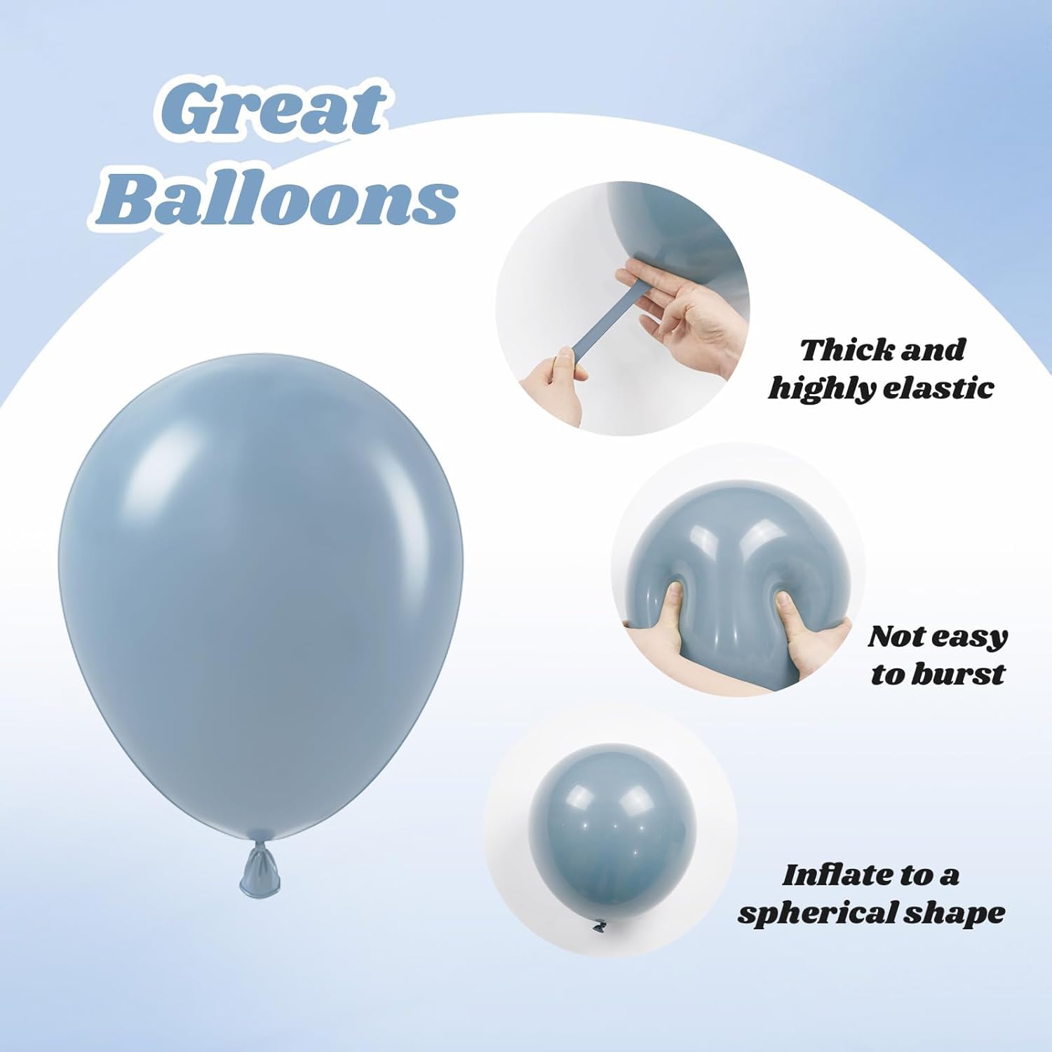 - Package Include: The blue balloons include 12inch dusty blue balloonsx20, 12inch pastel blue balloonsx15, 12inch sand white balloonsx15, 10inch metallic gold balloonsx10, glue dotx20, blue ribbonx1