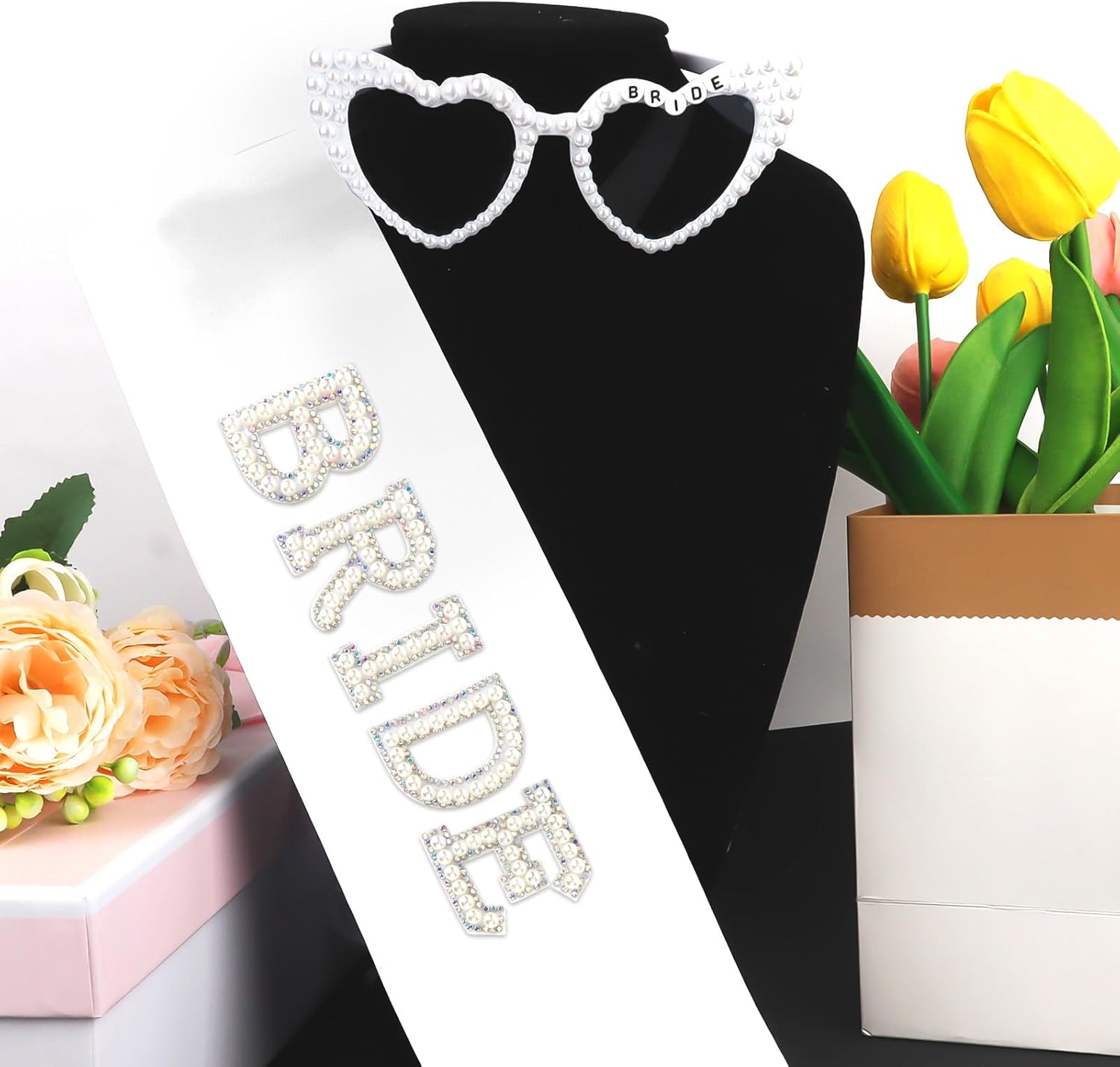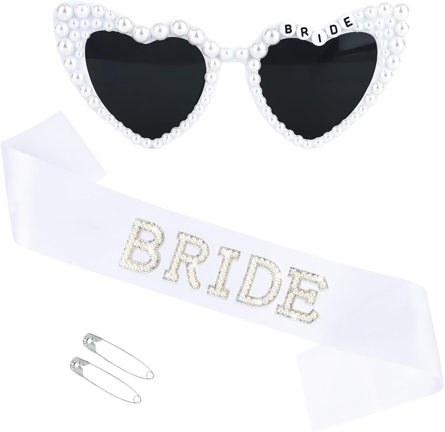 - Fit for All: Satin sash (66.93" long, 3.62" wide) Includes 2 pins to secure the sash, drapes flawlessly on any bod, while the white heart-shaped sunglasses suit all face shapes