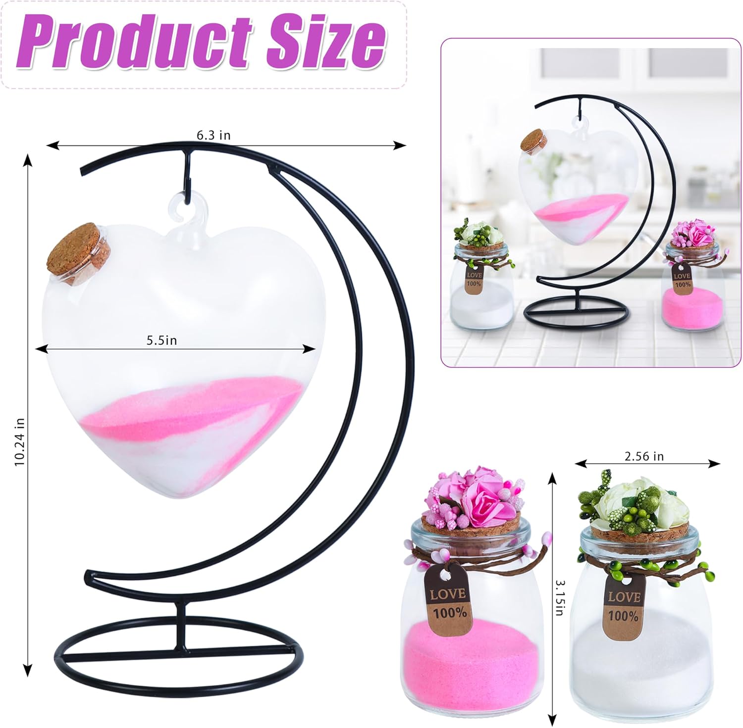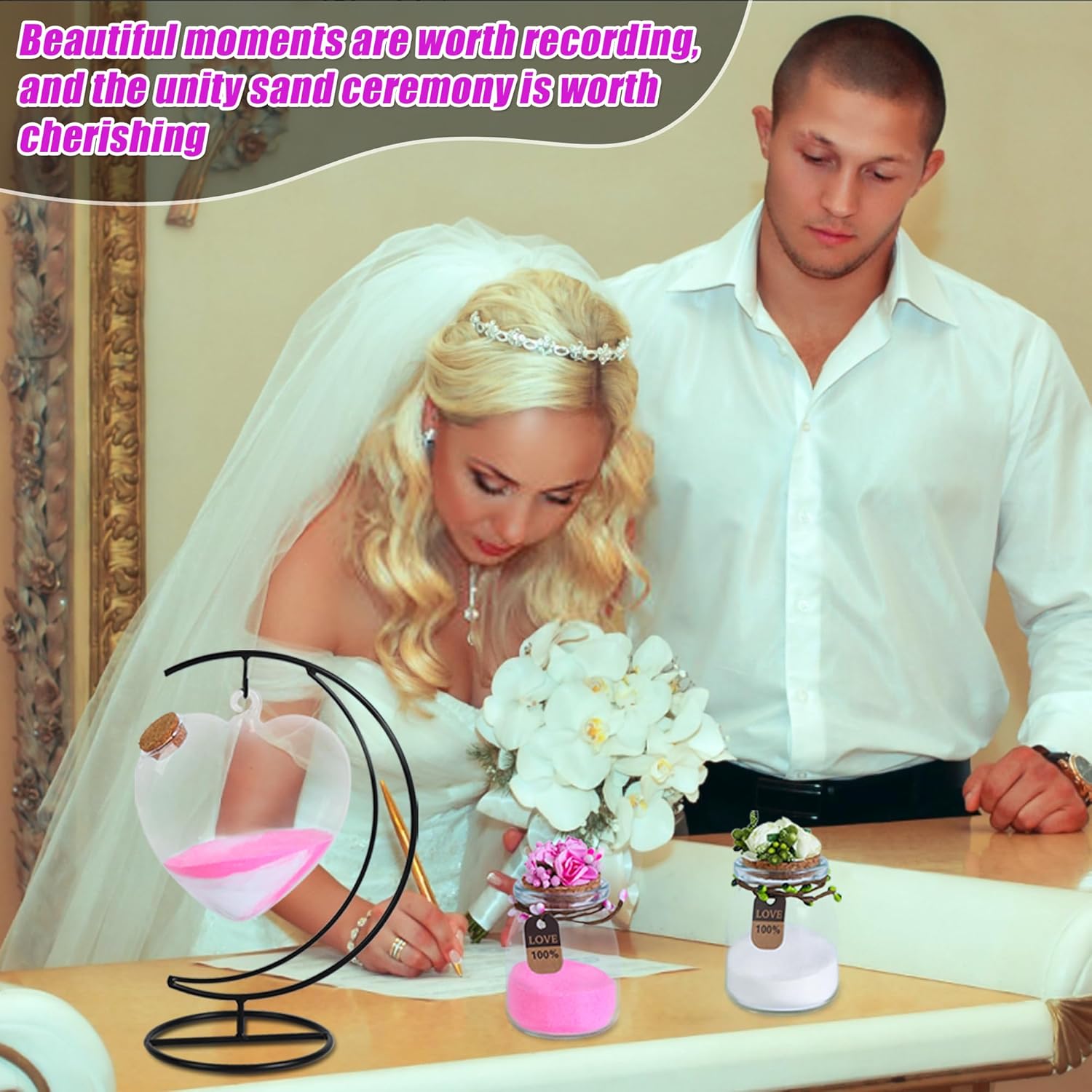 - Cute wedding sand ceremony kit: Unified sand wedding set includes a moon stand, a heart-shaped bottle with a wooden stopper that can be hung on the moon stand, 2 bags of wedding sand in different colors (white and pink), 2 ceremonial vases with flower garlands and white or pink flower caps, suitable for your wedding, creating an unforgettable sand ceremony and leaving a unique commemoration