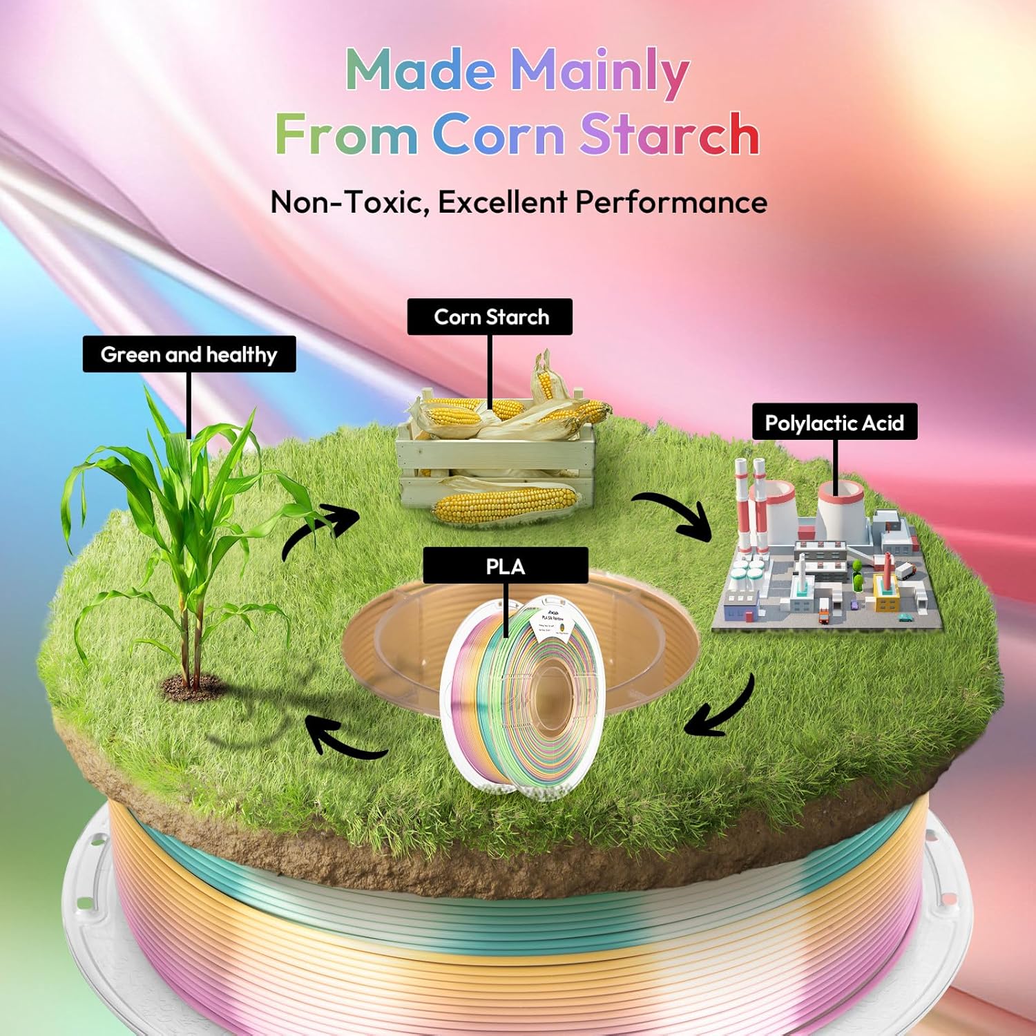 - Silk Rainbow PLA: Experiment with multiple hues without the commitment of larger spools. You can print beautiful multicolors in one PLA filament bundle, silk glossy smooth appearance, perfect for arts, crafts, DIY. Beginner & expert friendly