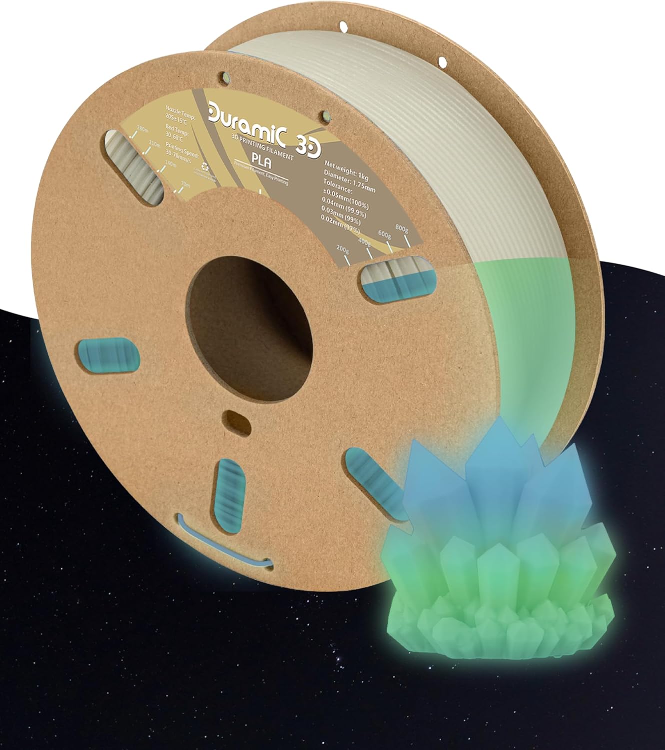 - Duramic 3D Pinter PLA Glow filament 1.75mm has gradually upgraded to cardboard spool along with dual stickers, which allows convenient sorting and full recycling. The filaments remain the same formula and quality.