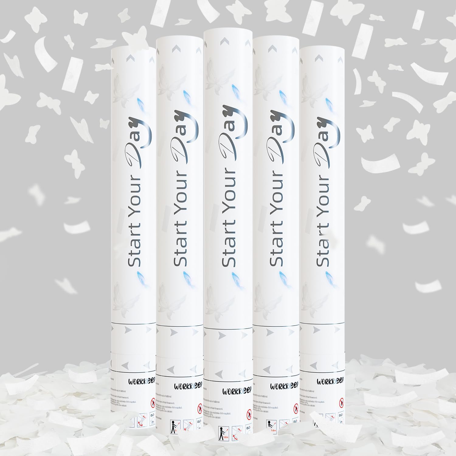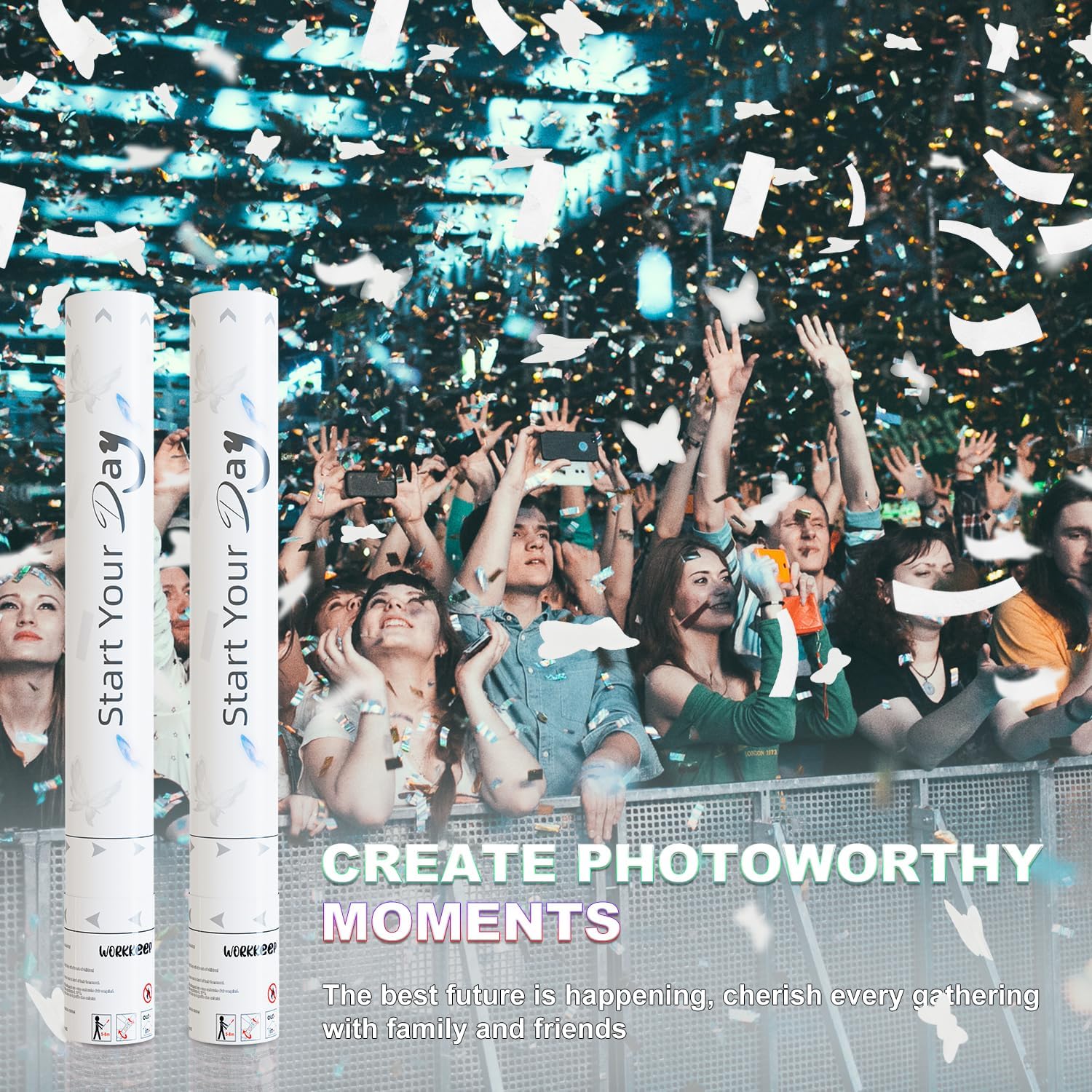 - Happy Celebration: - Each of our Confetti Cannons contains about 3 oz. More White biodegradable paper chips than any other similarly sized product on the market. You're sure to wow friends and family and capture awe-inspiring moments in the air in beautiful vibrant colors.