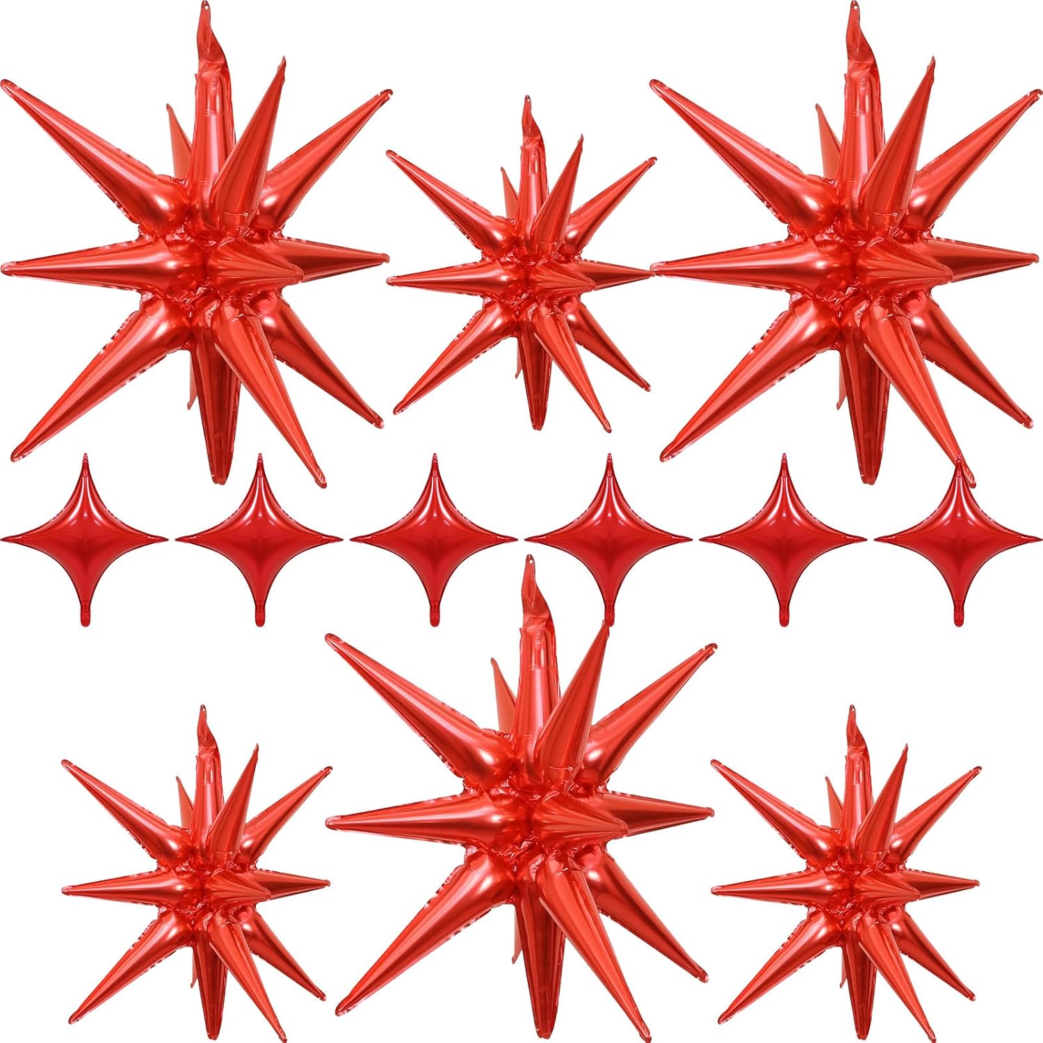 - One-piece Star Balloons: Includes 12pcs One-piece star burst balloons in bold colors: 3pcs × 27in , 3pcs × 22in explosion star balloons and 6pcs × 10in four angle star balloons. Arrives ready to use with 1 straw and 1 roll of ribbon—just inflate and decorate.