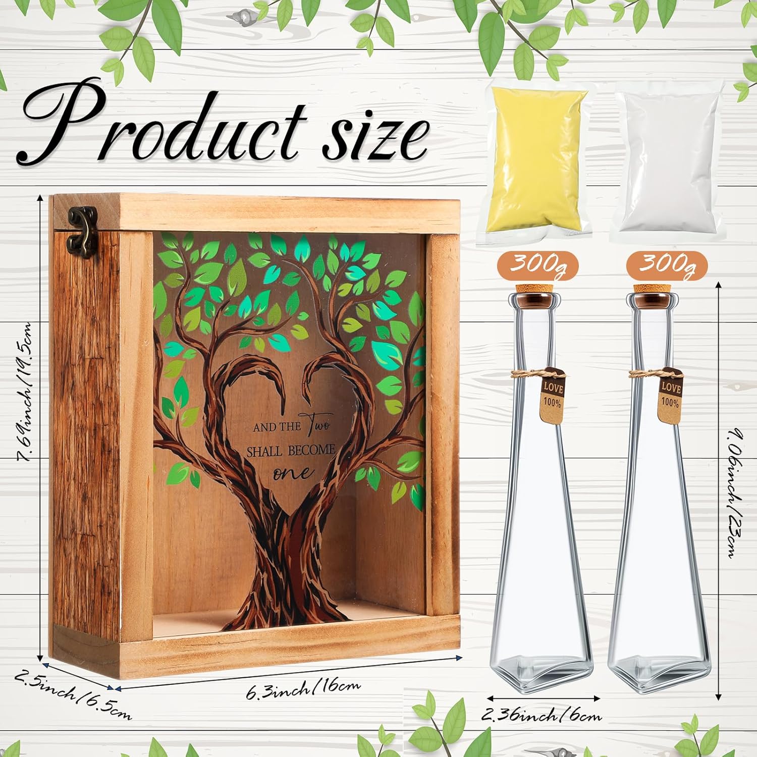 - Wedding Sand Ceremony Set: The package included 1 wooden sand unity ceremony shadow box, 2 glass wedding sand vases, 1 bag of white sand and 1 bag of yellow sand. Elevate your most cherished moments with our exquisite wedding sand ceremony sets, designed to symbolize the harmonious union of two souls in a timeless tradition