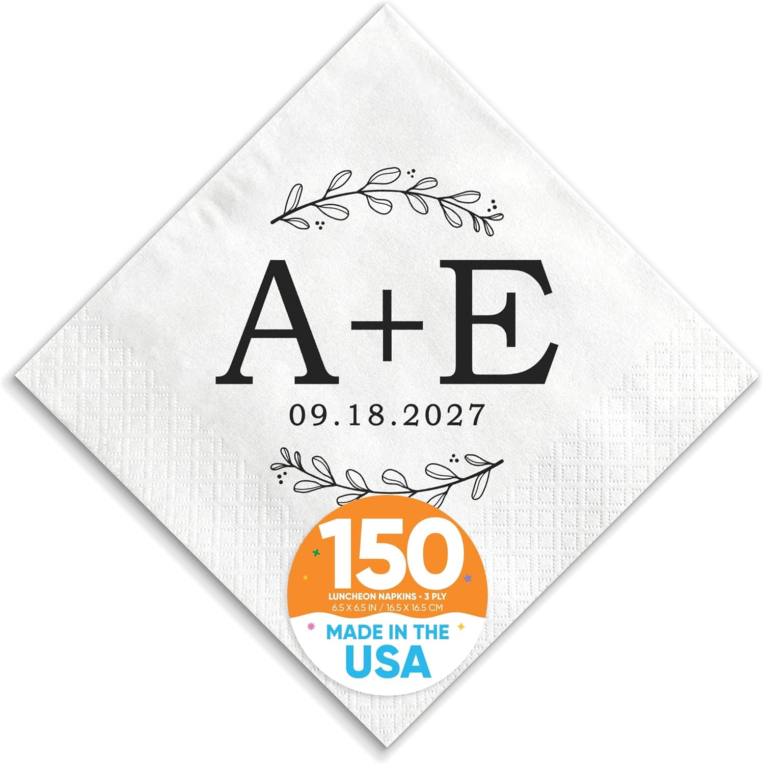 Big Dot of Happiness Personalized Rustic Leaves Monogram Wedding Napkins, Custom Engagement or Anniversary Party Laurel Wreath Branch Decor, White 3-Ply Paper Luncheon Napkins - 150 Count