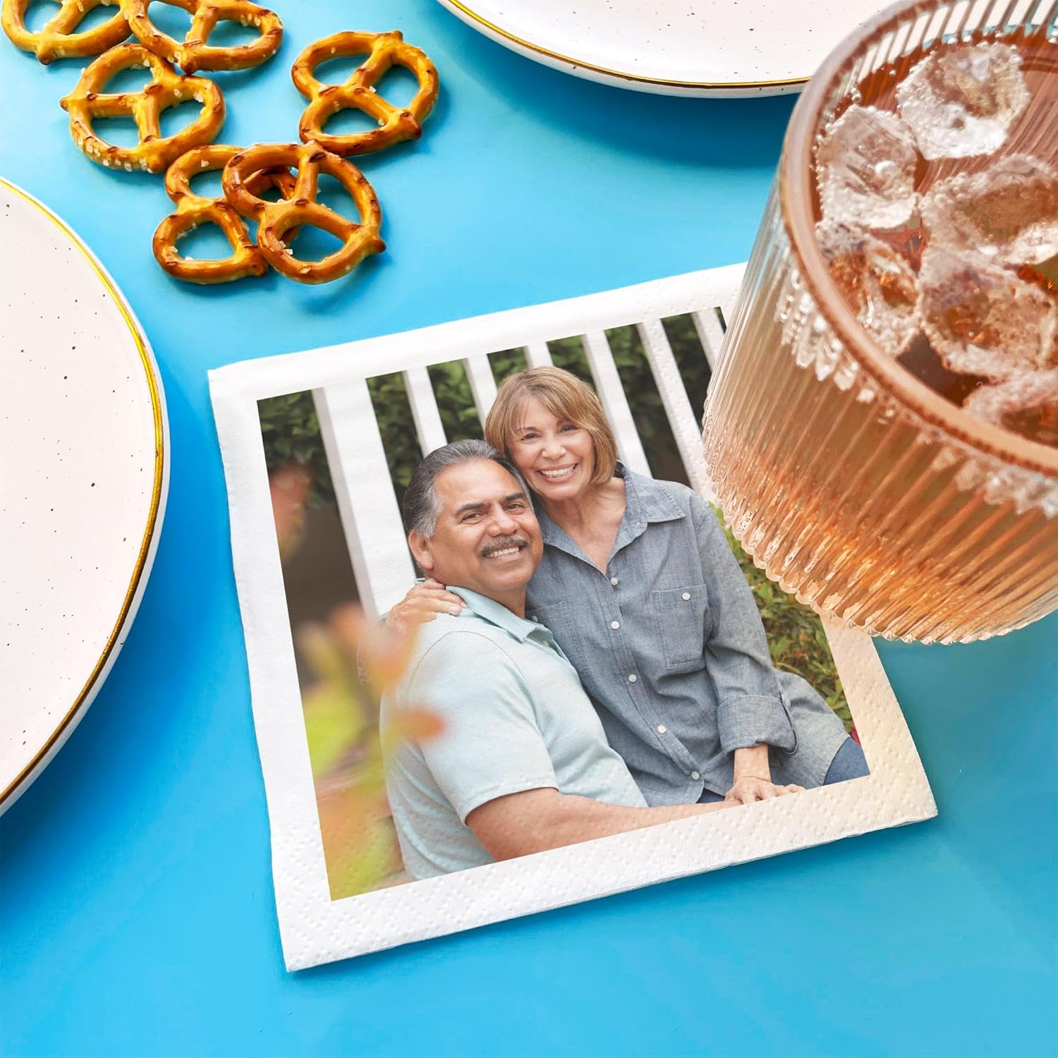 - Personalized Party Napkins: Elevate your celebration with custom photo cocktail napkins or dinner napkins—available in beverage (5" x 5") and luncheon (6.5" x 6.5") sizes. Whether it’s a milestone birthday or a bachelorette party, these personalized napkins add a hilarious touch to your table decor. Click “Customize Now” to upload one forward-facing photo.