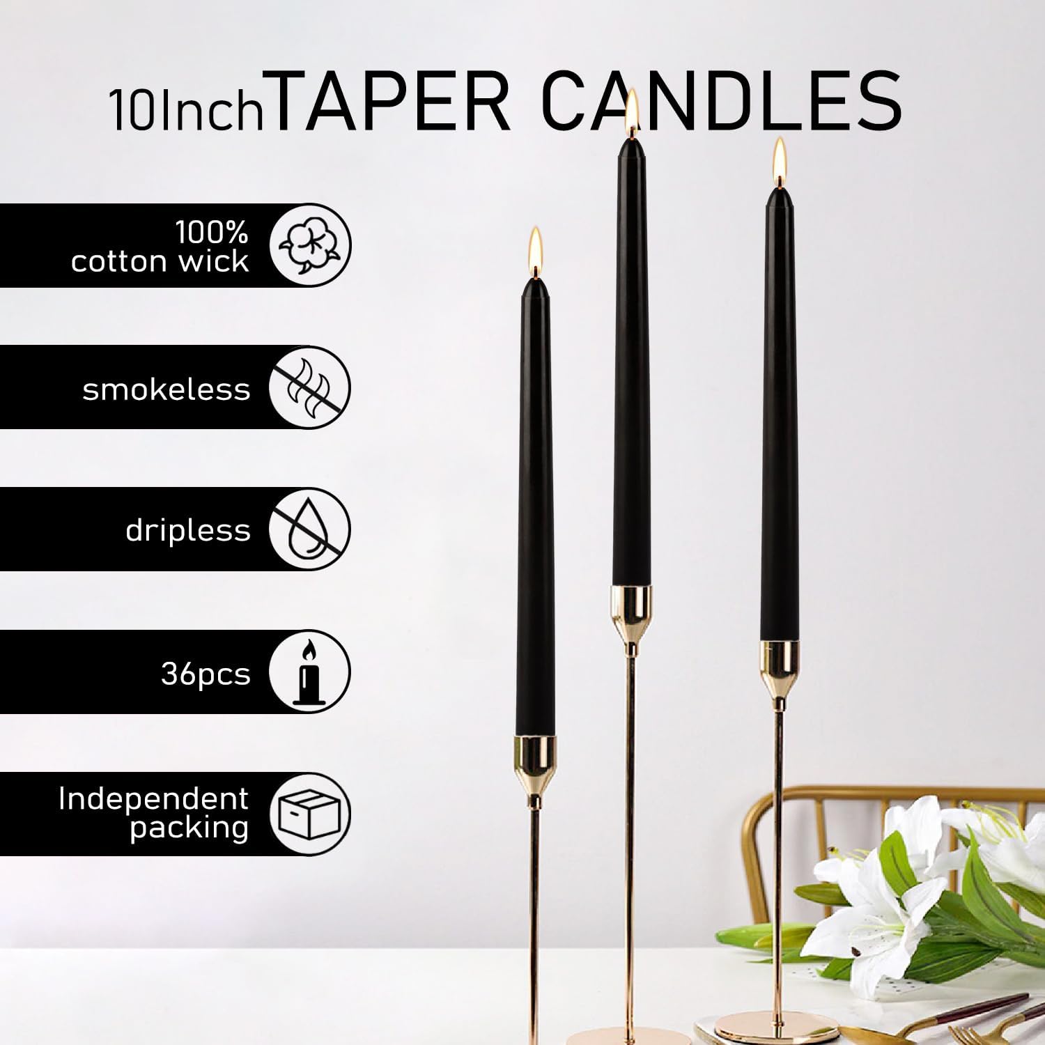 - 1. 【Premium 36-Pack Black Taper Candles】 Enhance your ambiance with this elegant set of 36 black taper candles, each 10 inches (25.4 cm) tall and 0.8 inches wide, designed to fit most candle holders. Perfect for home decor, parties, and spiritual practices.