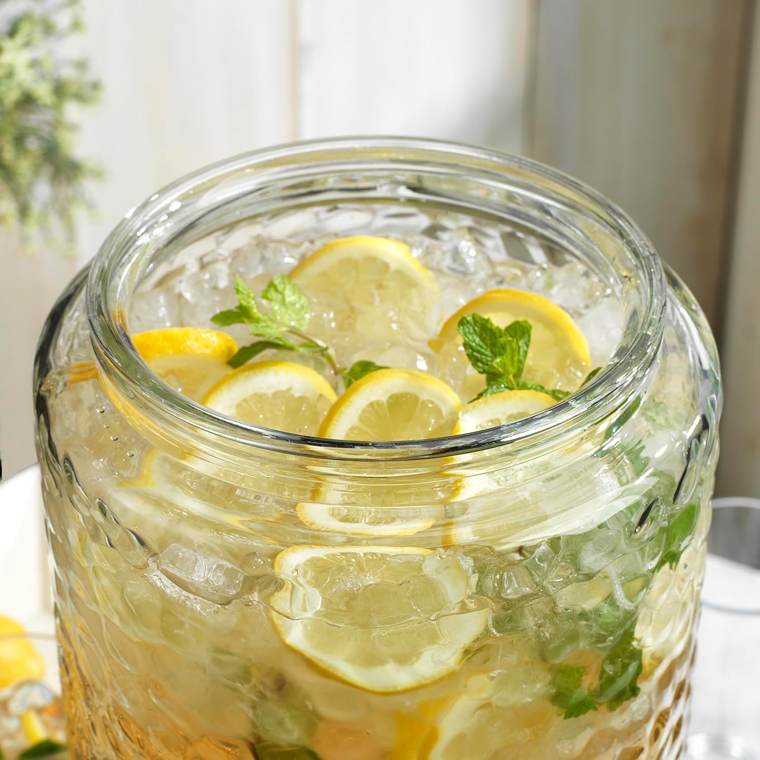 - Premium Glass - Constructed with premium grade durable glass with a beautiful hammered design. This dispenser will be a beautiful centerpiece wherever you use it. Great for outdoor, bars, & parties.