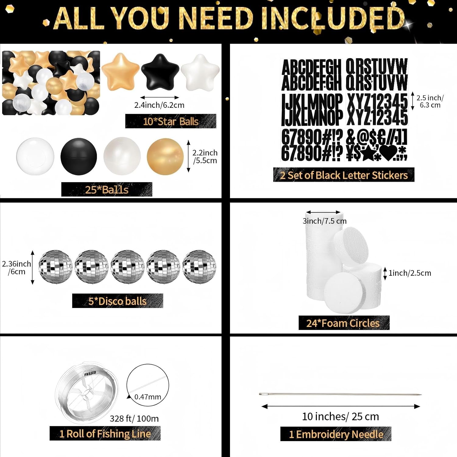 - Included Components : 25 Balls, 10 Star shaped balls, 5 Disco balls, 24 Foam circles, 1 Embroidery needle, 2 Sets of letter stickers (12 sheets), 1 Roll of fishing line 25 Balls, 10 Star shaped balls, 5 Disco balls, 24 Foam circles, 1 Embroidery needle, 2 Sets of letter stickers (12 sheets), 1 Roll of fishing line