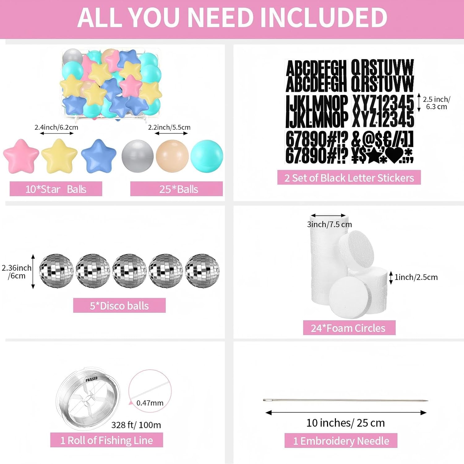 - Included Components : 25 Balls, 10 Star shaped balls, 5 Disco balls, 24 Foam circles, 1 Embroidery needle, 2 Sets of letter stickers (12 sheets), 1 Roll of fishing line 25 Balls, 10 Star shaped balls, 5 Disco balls, 24 Foam circles, 1 Embroidery needle, 2 Sets of letter stickers (12 sheets), 1 Roll of fishing line