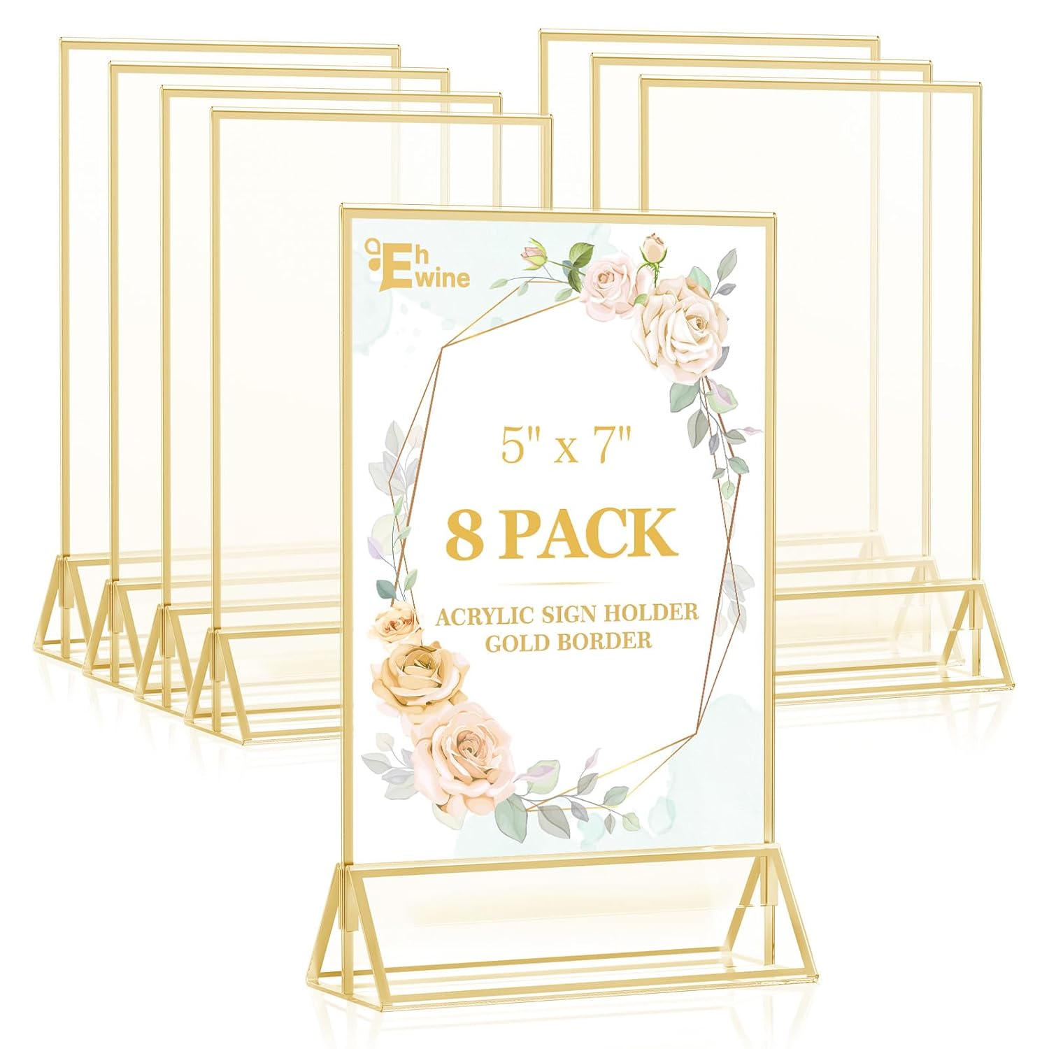 EHWINE 8 Pack 5×7 Clear Acrylic Sign Holder with Gold Borders and Vertical Stand, Double Sided Table Menu Holders Picture Frames for Wedding Table Numbers, Restaurant Signs, Photos and Art Display
