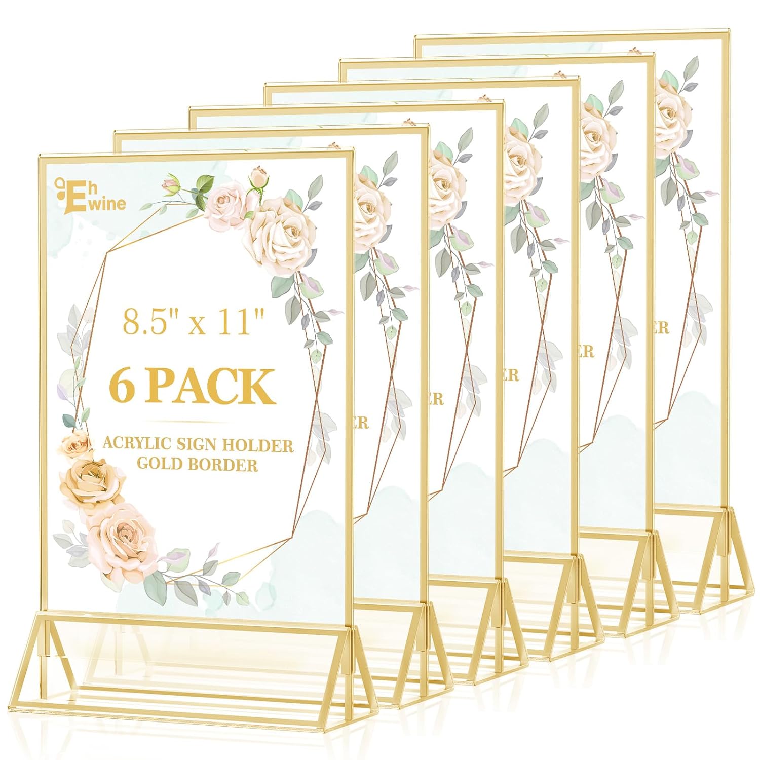 EHWINE 6 Pack 8.5×11 Clear Acrylic Sign Holder with Gold Borders and Vertical Stand, Double Sided Table Menu Holders Picture Frames for Wedding Table Numbers, Restaurant Signs, Photos and Art Display