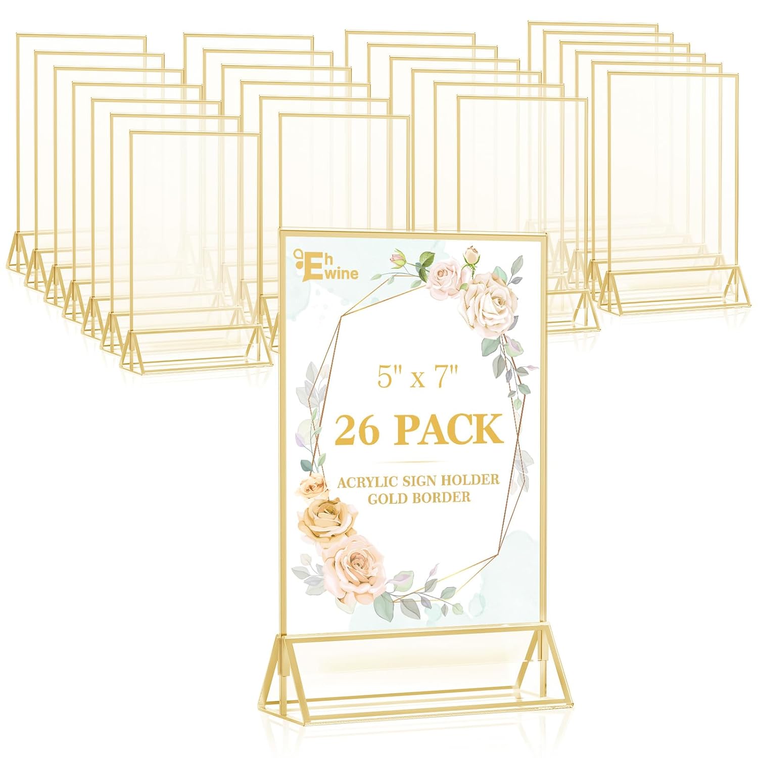 EHWINE 26 Pack 5×7 Clear Acrylic Sign Holder with Gold Borders and Vertical Stand, Double Sided Table Menu Holders Picture Frames for Wedding Table Numbers, Restaurant Signs, Photos and Art Display