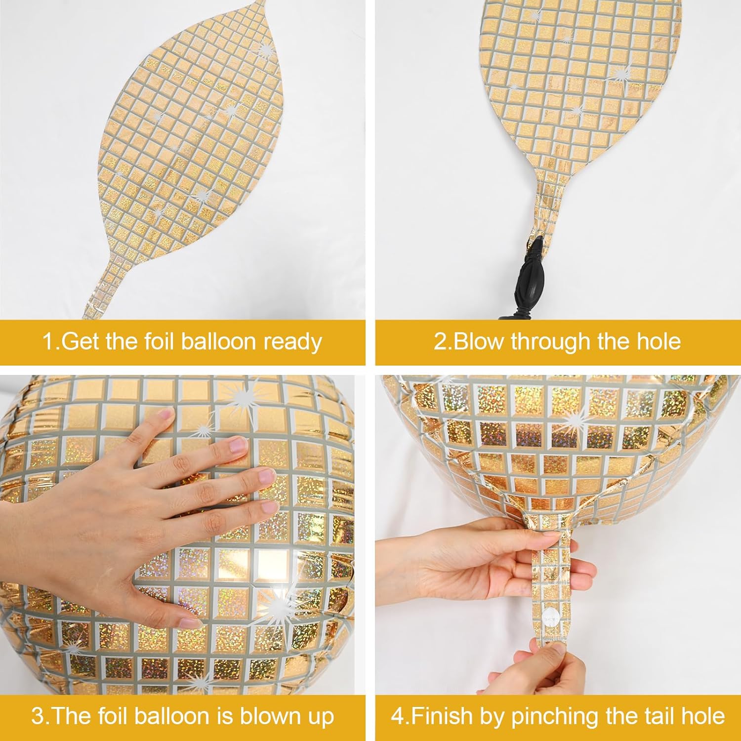 - EASY TO USE:These gold disco ball decorations balloons can be filled with air or helium.pinch the inflation port of the disco balloon to seal it.the set comes with a straw and ribbon,after the party is over,use the straw to deflate by inserting it into the inflation port,balloons can be reused