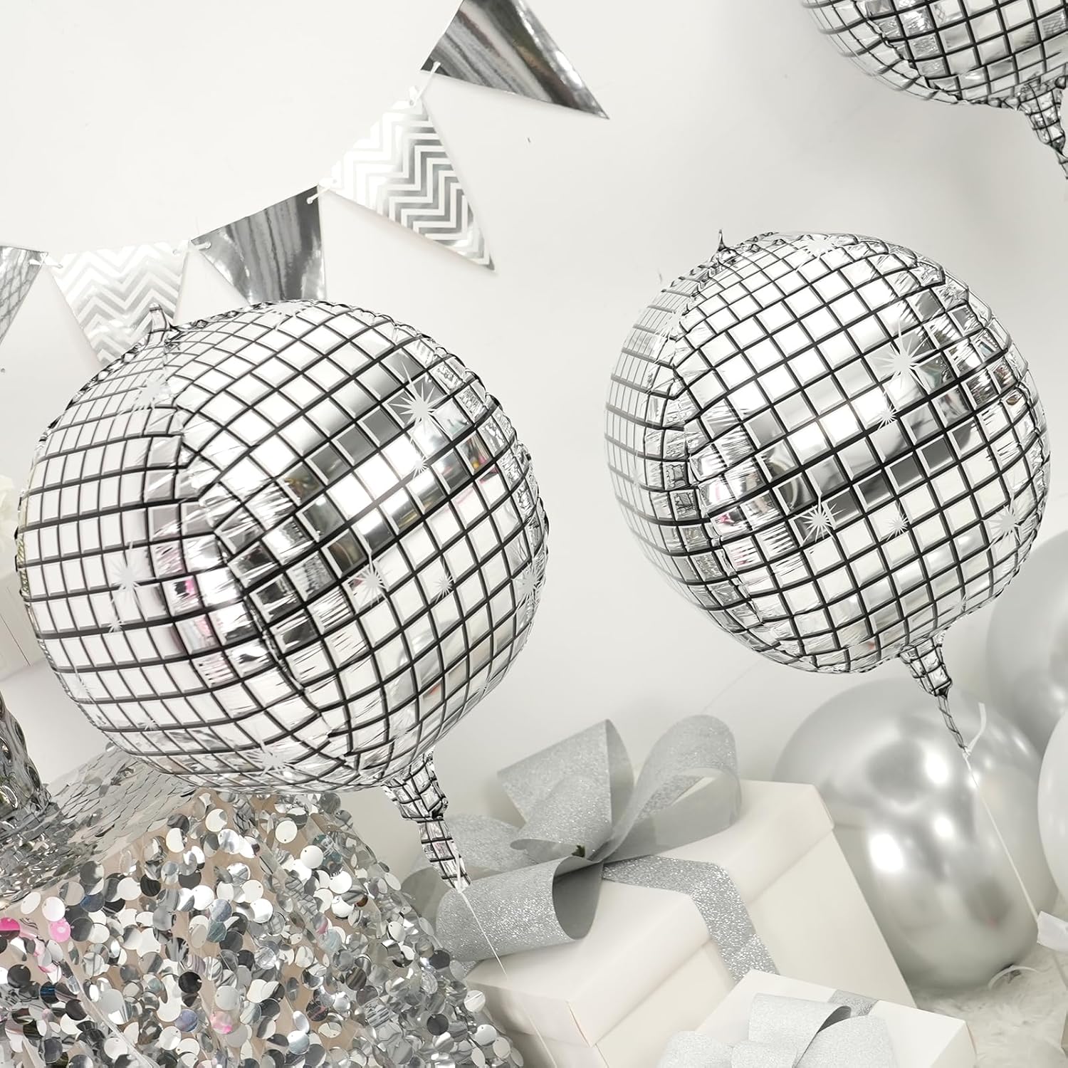 - MATERIAL:Our 22inch silver giant 4d disco ball balloons are with neat edges,not easy to explode and leak,non-toxic,with vibrant colours,Combine them with complementary décor for an eye-catching setup.