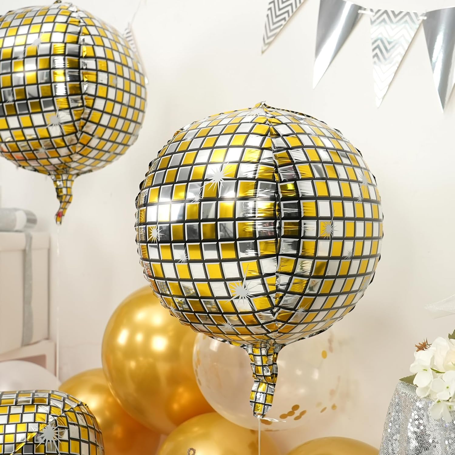 - MATERIAL:Our 22inch gold silver giant 4d disco ball balloons are with neat edges,not easy to explode and leak,non-toxic,with vibrant colours,Combine them with complementary décor for an eye-catching setup.