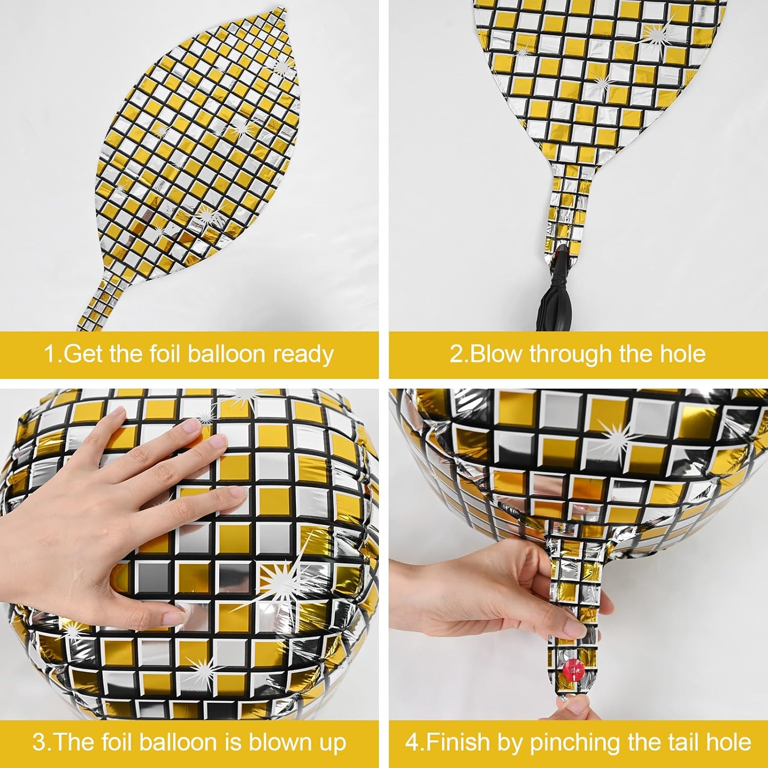 - EASY TO USE:These gold silver disco ball decorations balloons can be filled with air or helium.pinch the inflation port of the disco balloon to seal it.the set comes with a straw and ribbon,after the party is over,use the straw to deflate by inserting it into the inflation port,balloons can be reused