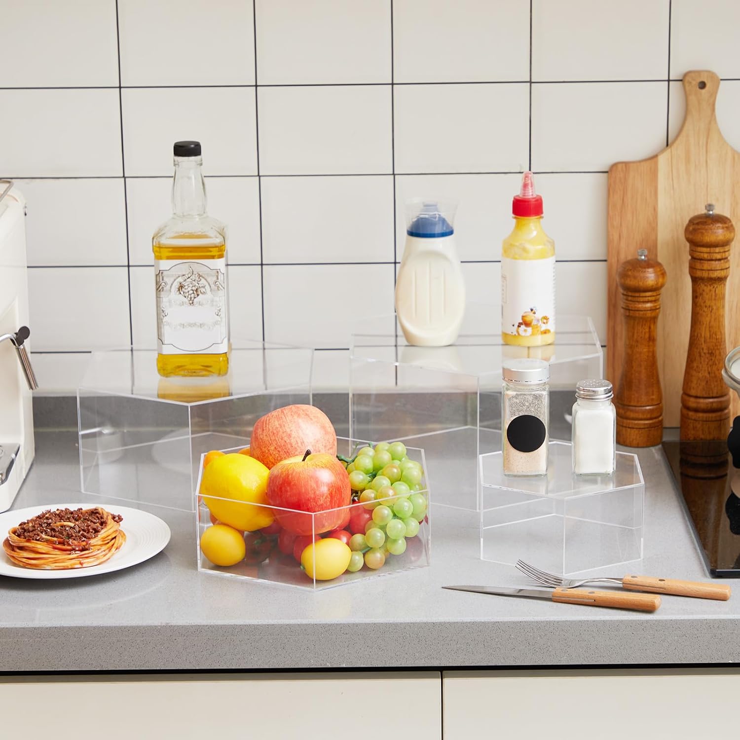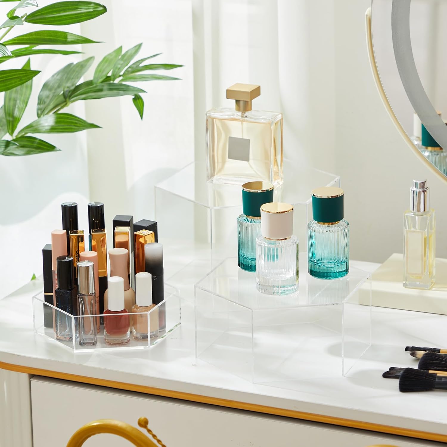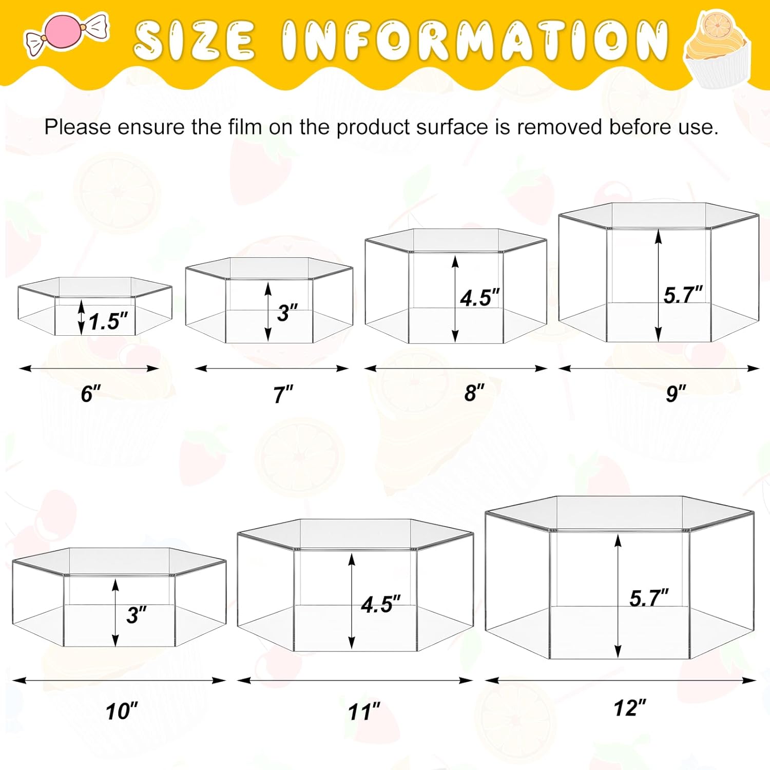 - Versatile Size: these hexagonal acrylic display stands come in a varied size combination that caters to most of your display needs; Boasting a set of 7, measures about 6 x 6 x 1.5 inches, 7 x 7 x 3 inches, 8 x 8 x 4.5 inches, 9 x 9 x 6 inches, 10 x 10 x 3 inches, 11 x 11 x 4.5 inches and 12 x 12 x 6 inches; Please check the size of the second picture carefully before purchasing
