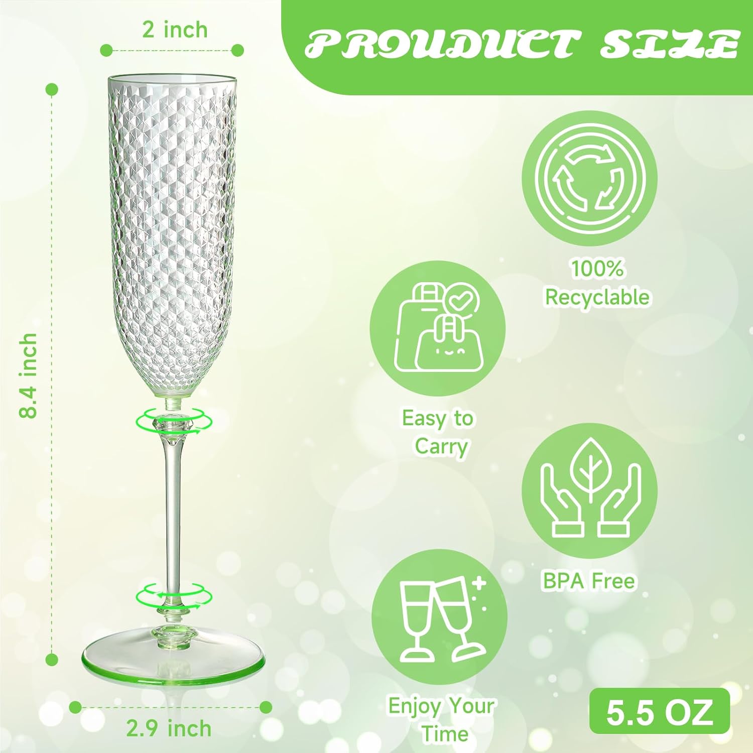 - Sufficient Quantity: The set contains 24 Green detachable Stemware plastic champagne glasses, each measuring approximately 2.87x8.43 inches with a capacity of 5.5 ounces. These champagne glasses are suitable for various drinks, such as champagne, whisky, red wine, sparkling cocktails, mojitos, liquors.