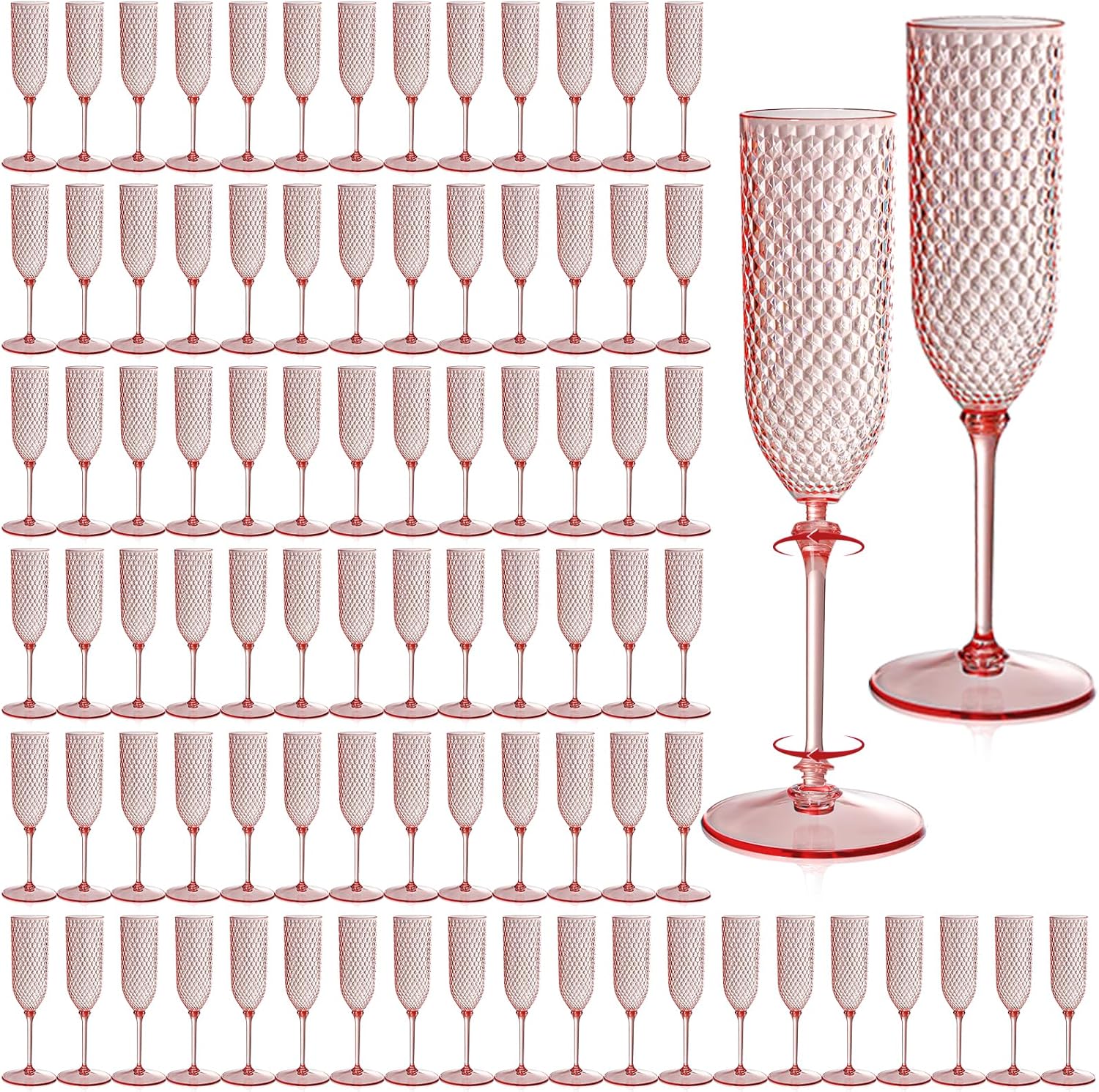 - Sufficient Quantity: The set contains 100 pink detachable Stemware plastic champagne glasses, each measuring approximately 2.87x8.43 inches with a capacity of 5.5 ounces. These champagne glasses are suitable for various drinks, such as champagne, whisky, red wine, sparkling cocktails, mojitos, liquors.