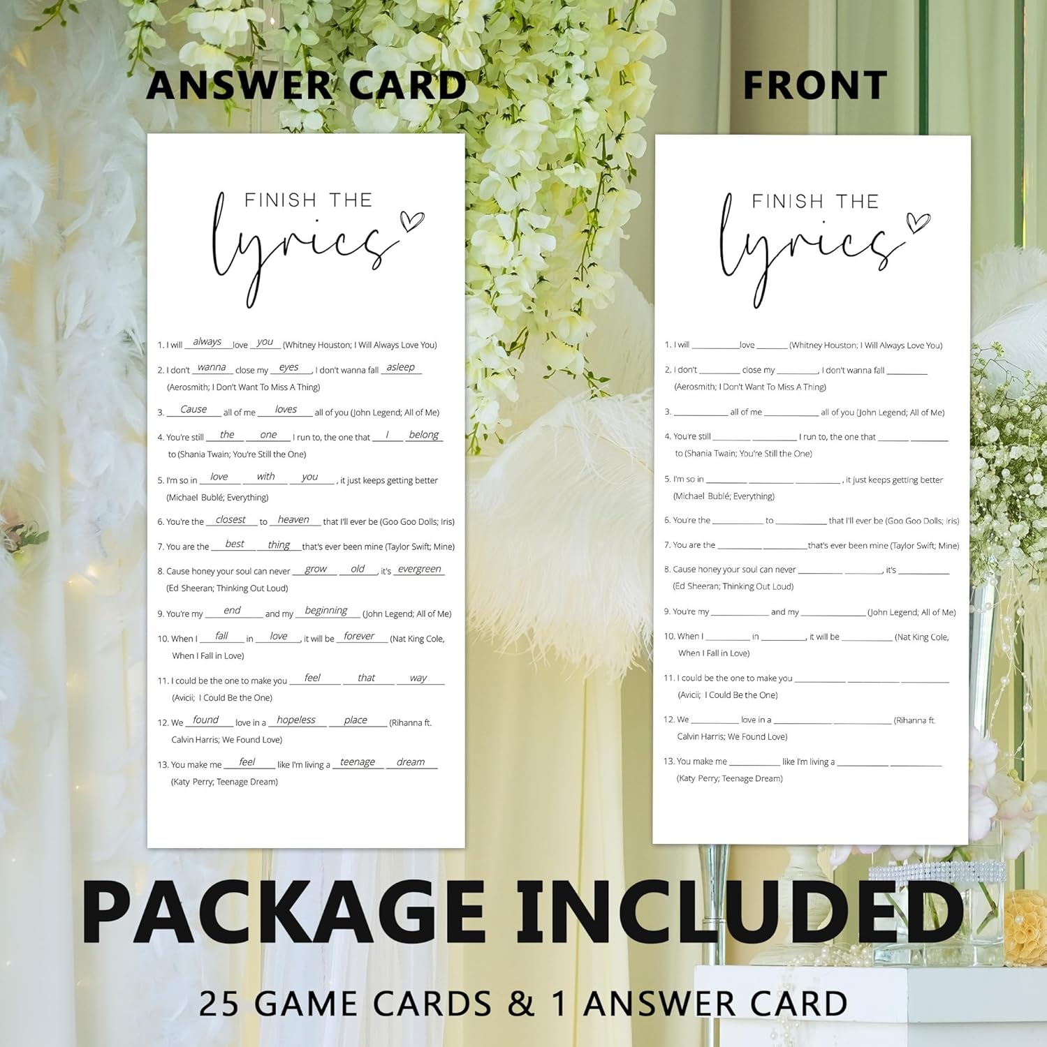 Bridal Shower Games, Finish the Lyrics, 25Pcs 4x9inch Minimalist White Double-Sided Bridal Game Cards with 1 Answer Key, Wedding Shower Games for Guests, Engagement Bachelorette Party Supplies - A09