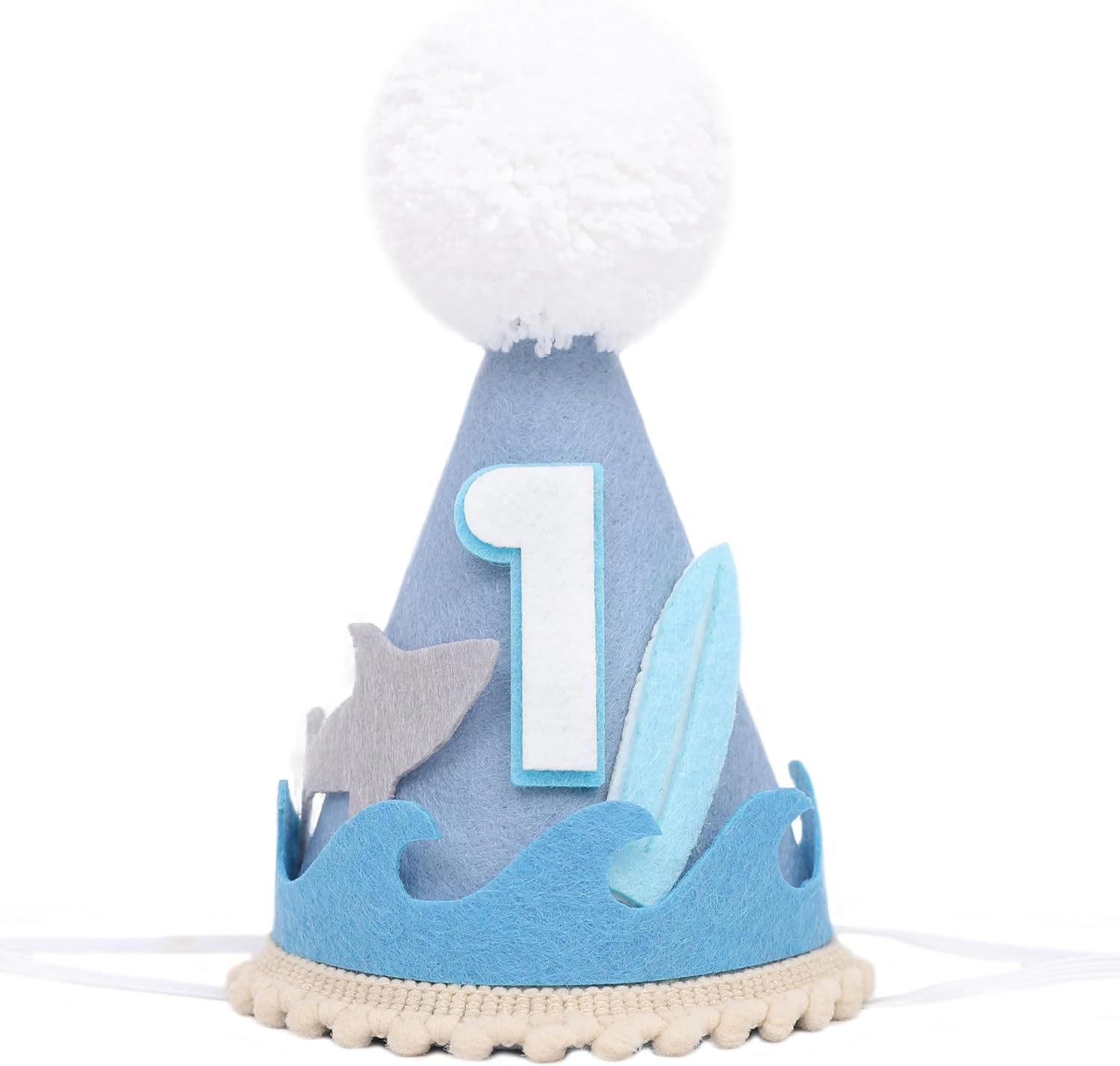 - SHARK 1ST BIRTHDAY PARTY DECORATIONS: The ocean themed birthday hat is made of blue felt fabric with felt wave trim. It will become a striking accessory for cute parties, carefully handled and stored, and can be reused