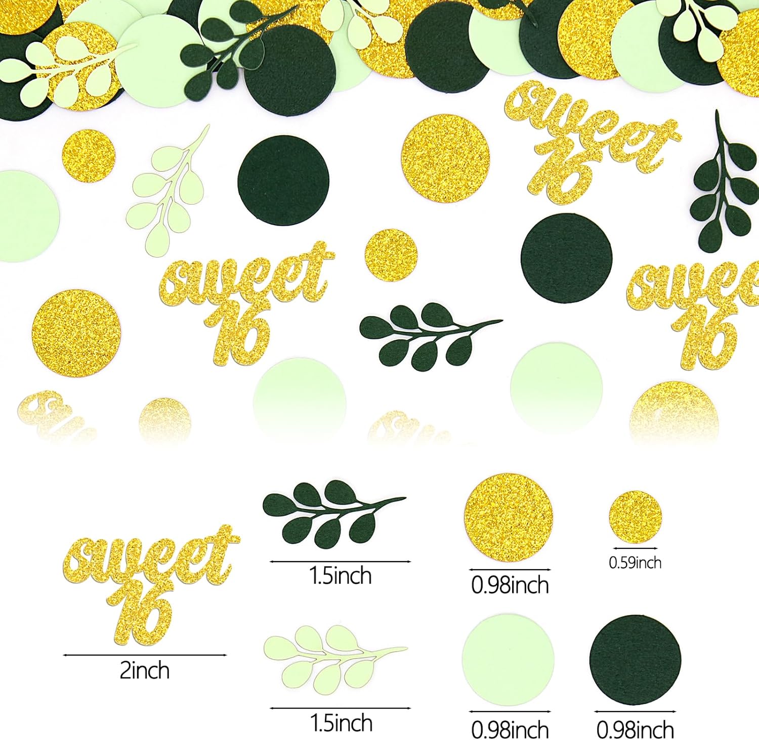 - 4.Proper Size and Great Material.The cute birthday table scatters is with sturdy bright paper card,with nice size--big round confetti 0.98inch small dot 0.59inch,sage leave 1.5inch sweet 16 letter 2inch,looks great to make your tables shine and bright up your party in your lovely sweet 16 birthday era.