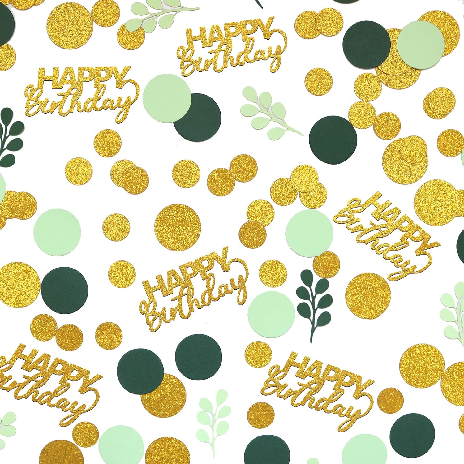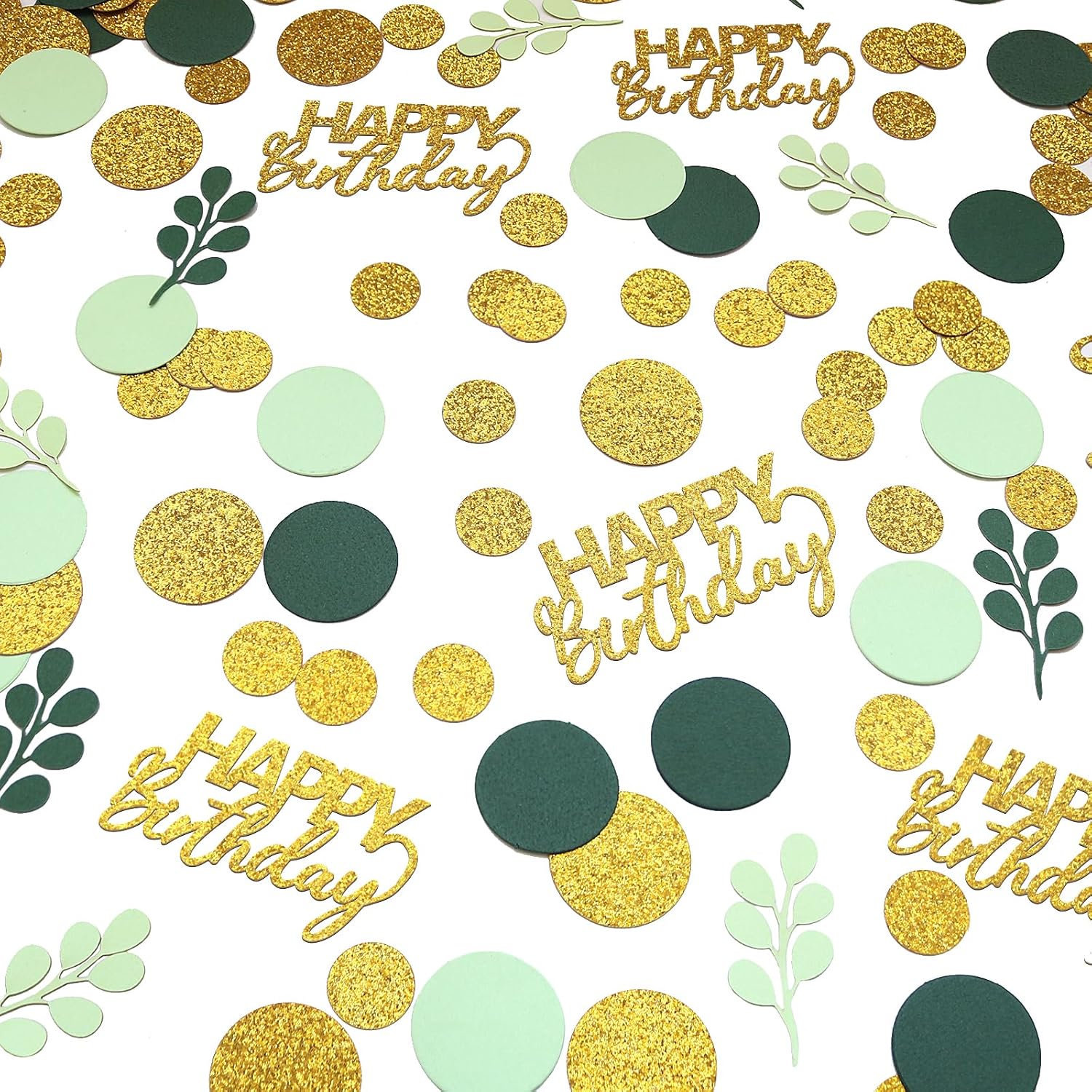 - 1.Great Addition to Your Birthday Party.The green and gold circle dots with happy birthday letter confetti scatter are shiny and fresh,very sparkle,a perfect addition to any age birthday party,from baby kids to adults,from girl boy to men women,nice green birthday decorations.