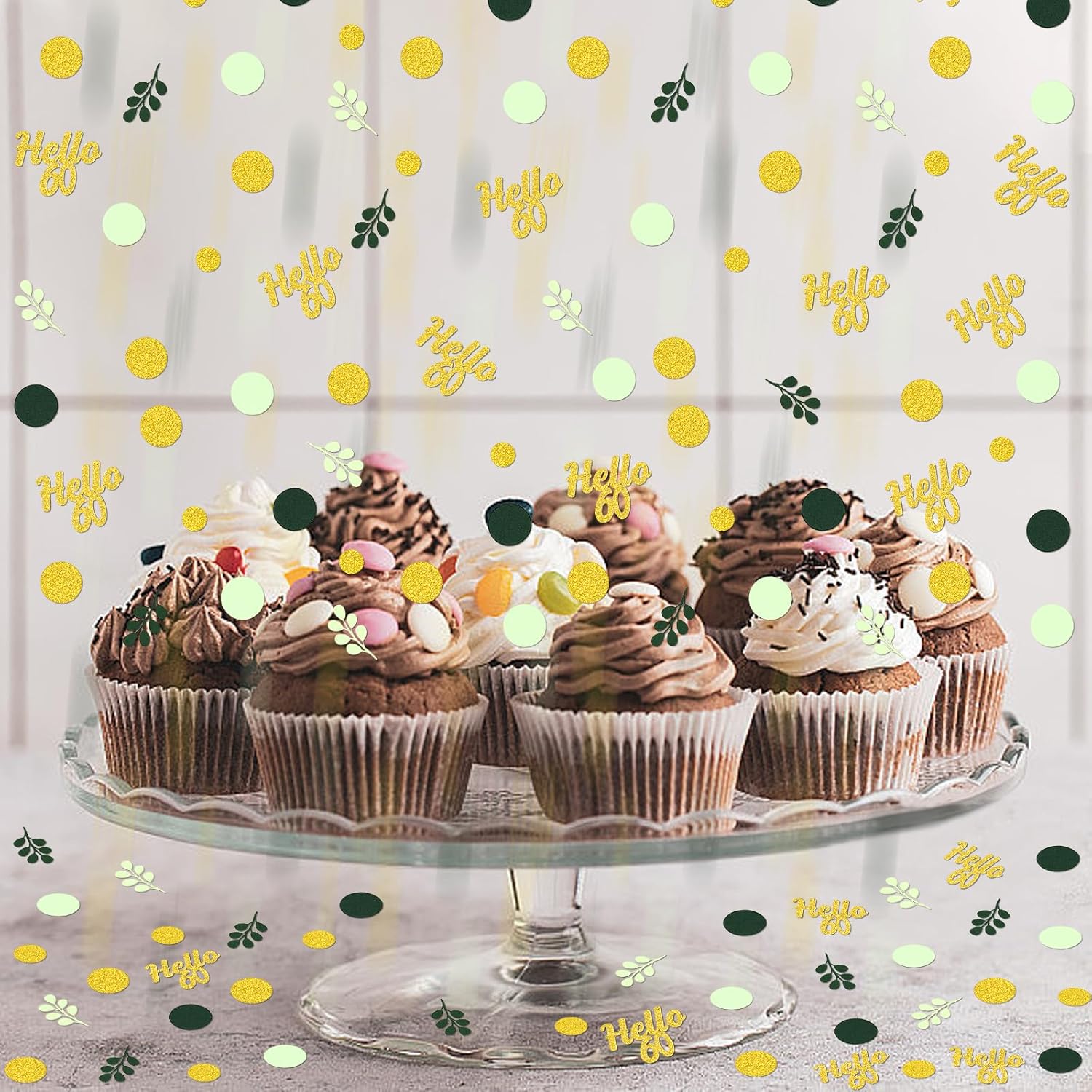 - 1.Great Addition to 60 Birthday Party.The green and gold circle dots with hello 60 confetti scatter are shiny and fresh,very sparkle,a perfect addition to 60th birthday theme,nice sage green 60th birthday decorations for women/men.