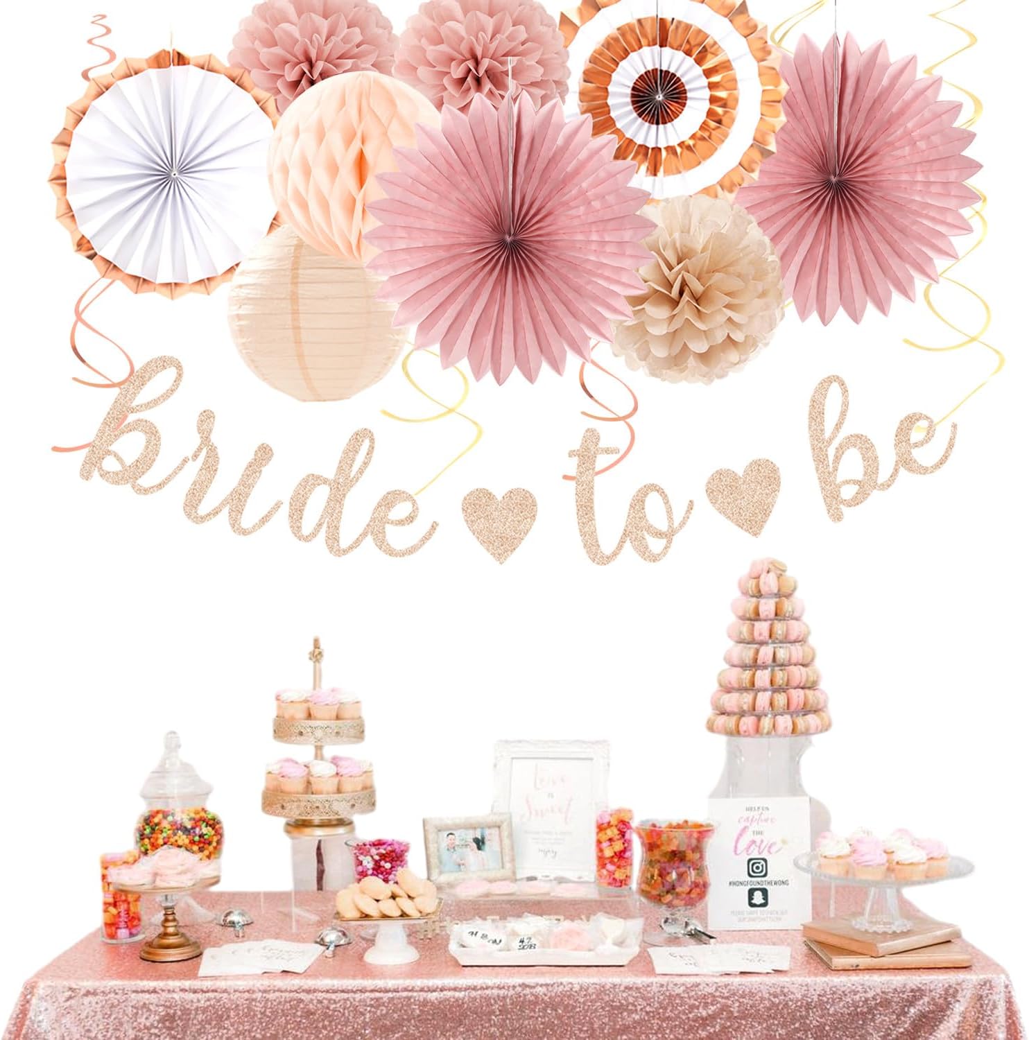 - 【Package Content】Blush pink rose gold fall bridal shower party decorations contains: 1 pcs bride to be banner, 1 pcs circle dots paper banner, 3 pcs hanging paper lanterns, 4 pcs tissue paper pom poms, 2 pcs honeycomb balls, 4 pcs paper fans, 6 paper swirls, total 21 pcs in 8 12 16 inch and blush pink rose gold peach color.