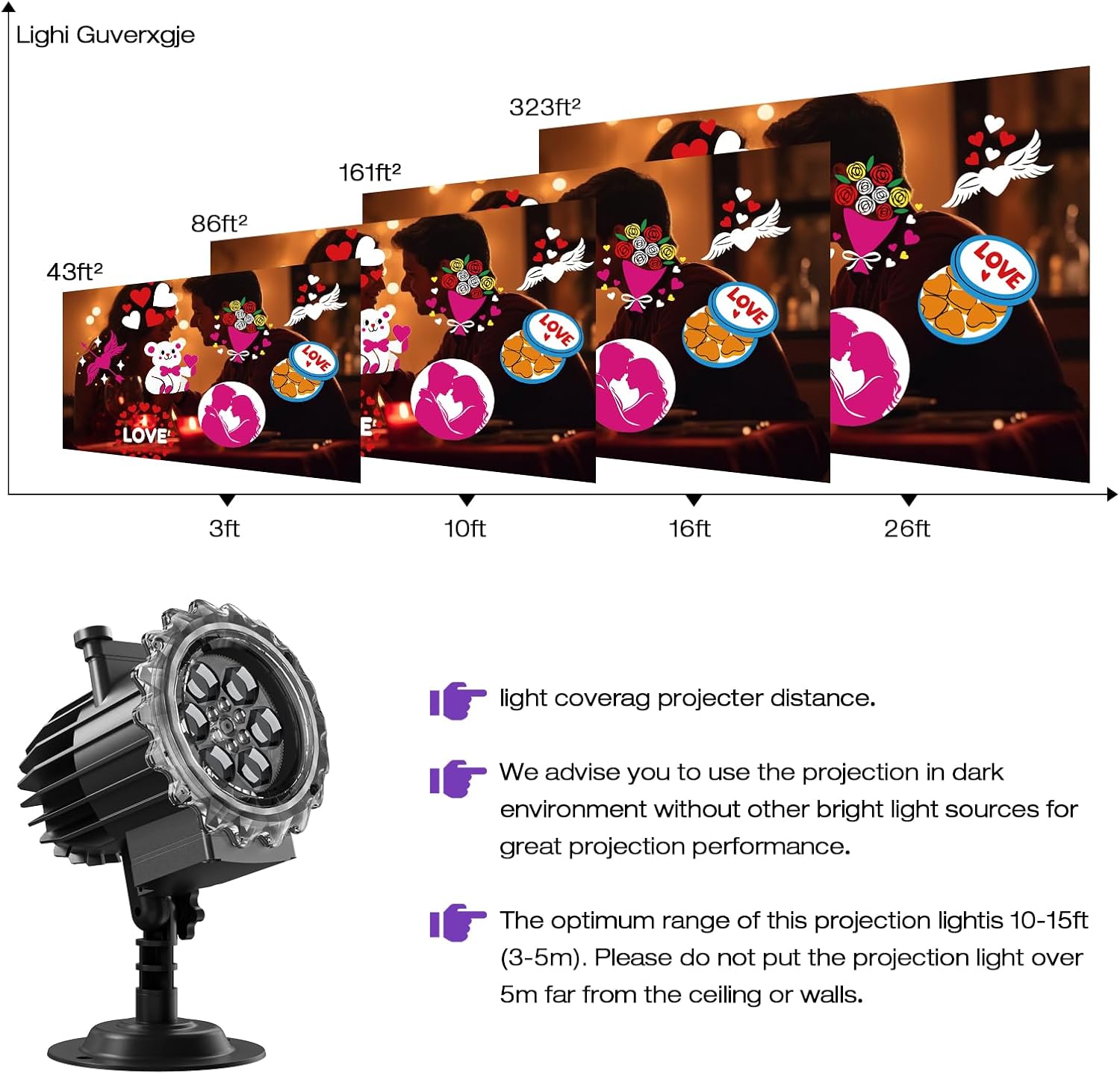 - Vivid HD Imagery with Expansive Coverage Experience bright, non-fading projector Christmas lights that cover up to 538 sq. ft. Optimize clarity at 12-16ft distances—works great as outdoor Christmas lights projector or Christmas light projector indoor