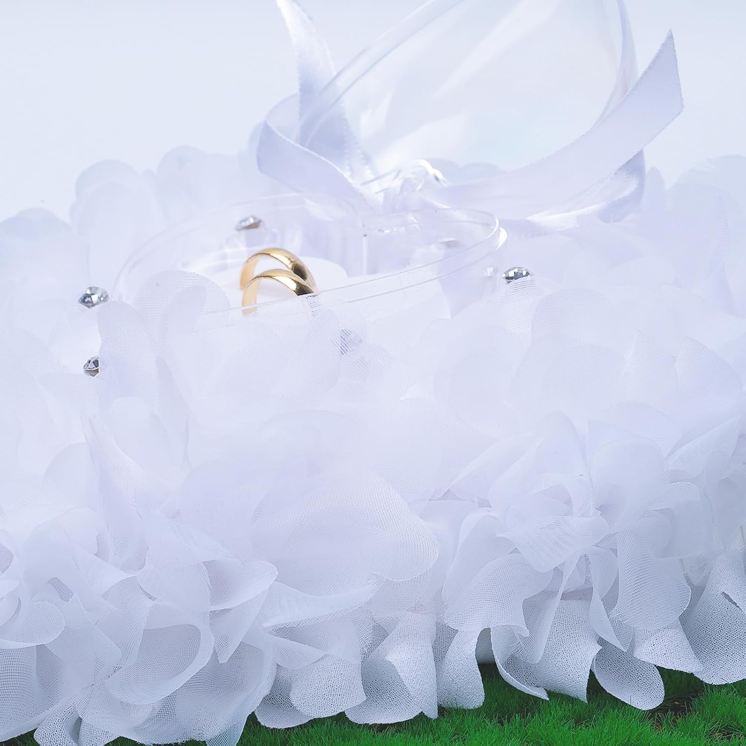- Wedding Ring Pillow Design - Our Ring Bearer Pillows Is Exclusively Designed By Our Designer, With Pure White Flowers Wrapped Around Roses And Dotted With Artificial Diamonds In The Middle, Surrounded By A Transparent Heart-Shaped Ring Box. The Ring Cover Can Be Easily Removed, And There Is A Hanging Rope Design On The Top That Can Be Hung Anywhere On The Wall. The Ring Box Has A Unique Decoration And Can Store Two Rings. The Design Of The Ring Box Can Prevent The Ring From Falling Off And Being Exposed To Dust And Moisture.
