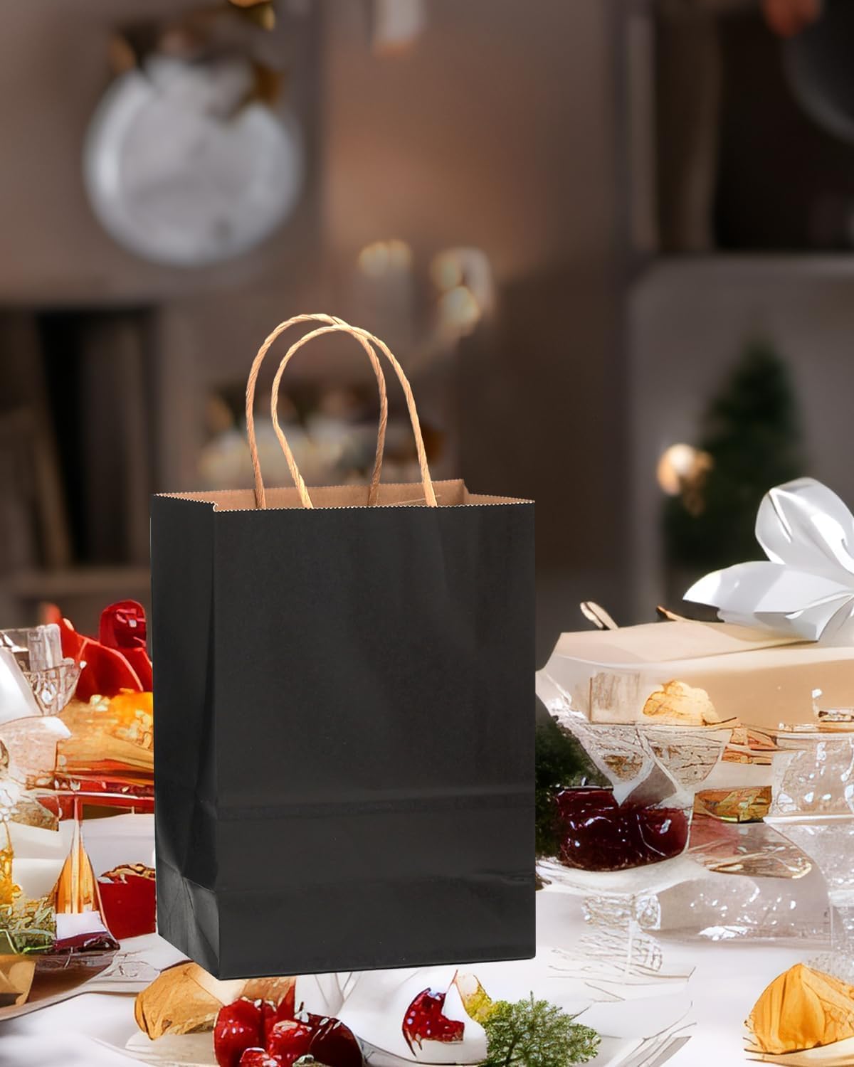 qiqee 50-Packs Black Paper Gift Bags with Handles Bulk 8.3"x3"x 6" Small Size Paper Bags Multiple Uses(Small Size)