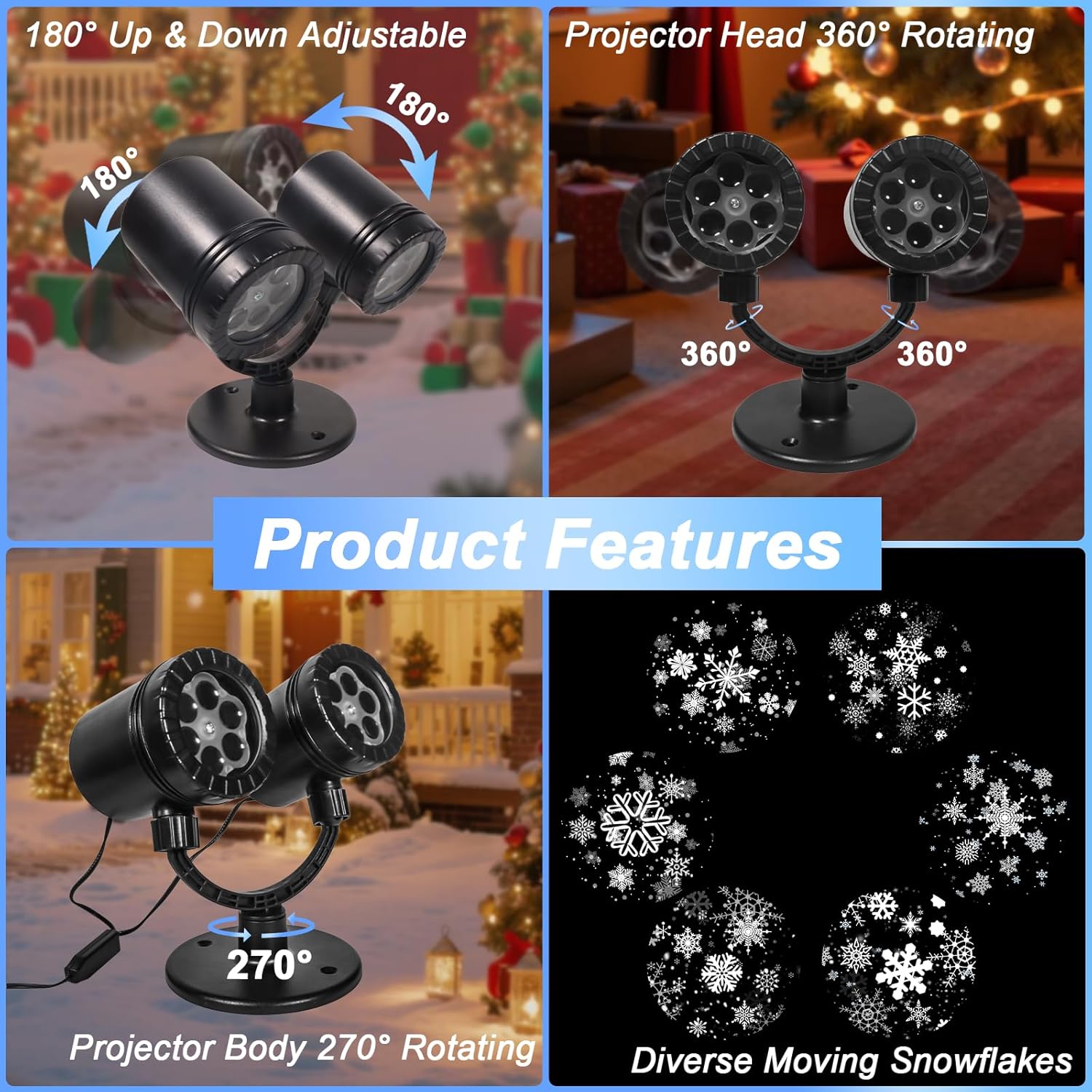 - 【Upgraded Christmas LED Snowflake Projector】The 2-Head white snowflake projector can brighten your outdoor Christmas decor with 8 built-in snowfall lamp beads projection. Its upgraded optics deliver a wider, brighter projection with realistic swirling snowflakes and falling snow animations. The auto-rotating function creates a near-lifelike winter scene—perfect for covering walls or ceilings with magical Christmas holiday charm.