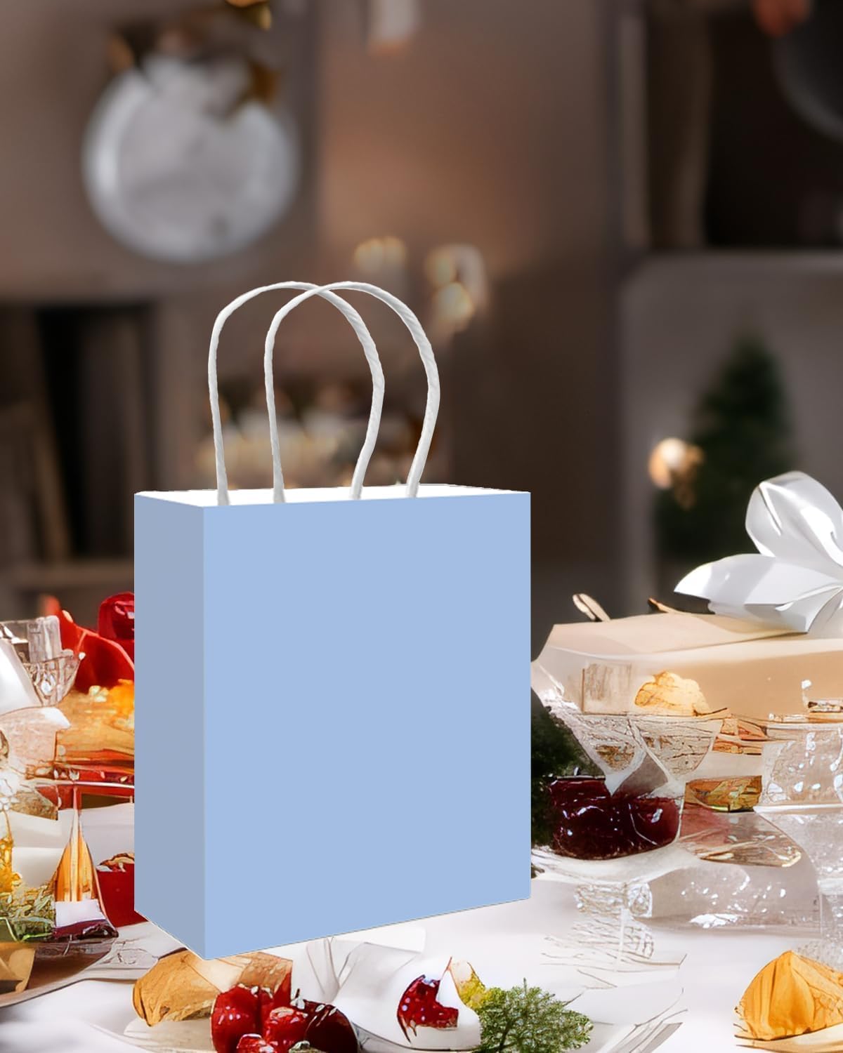 qiqee 50-Packs Gift Bag with Handles Bulk Light Blue Paper Bags Multiple Uses (8.3"x3"x6" Small Size)