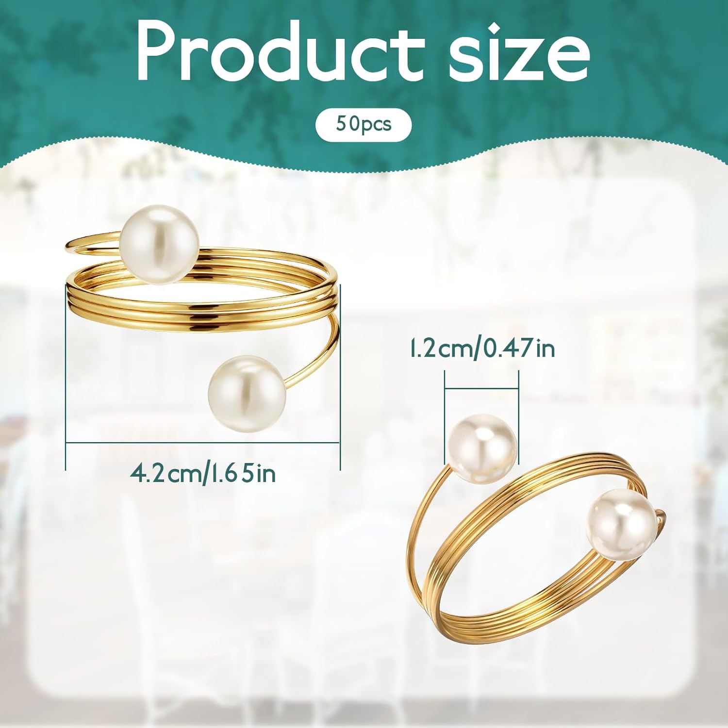 - 【Ample Quantity】Upgrade your table settings with this set of 50 elegant gold pearl napkin rings, perfect for large gatherings like weddings, Christmas, and Thanksgiving. Each metal spring napkin holder features dual pearls (1.2cm diameter) for a luxurious touch. The 4.2cm diameter rings fit most cloth napkins, making them ideal for any festive occasion.